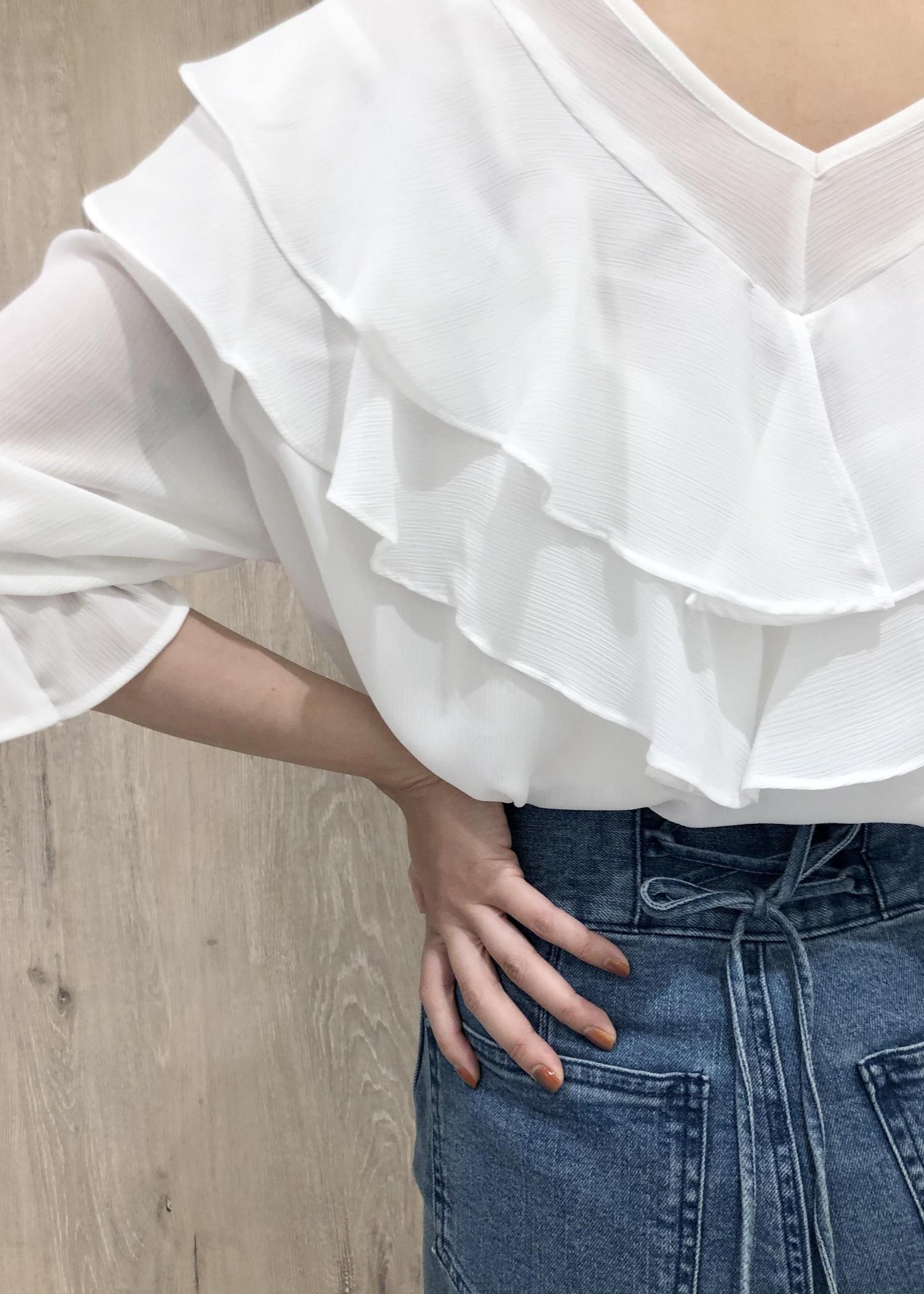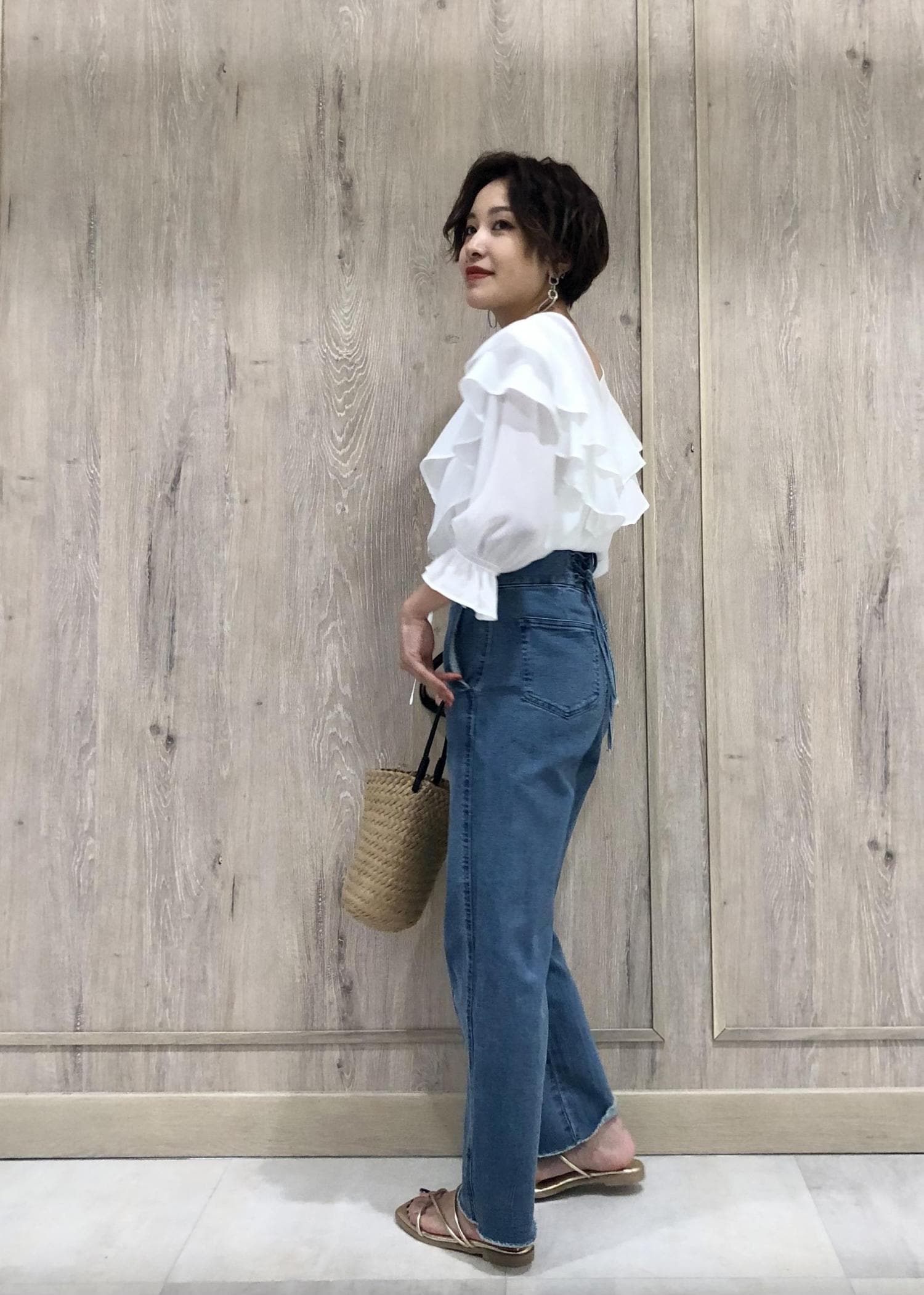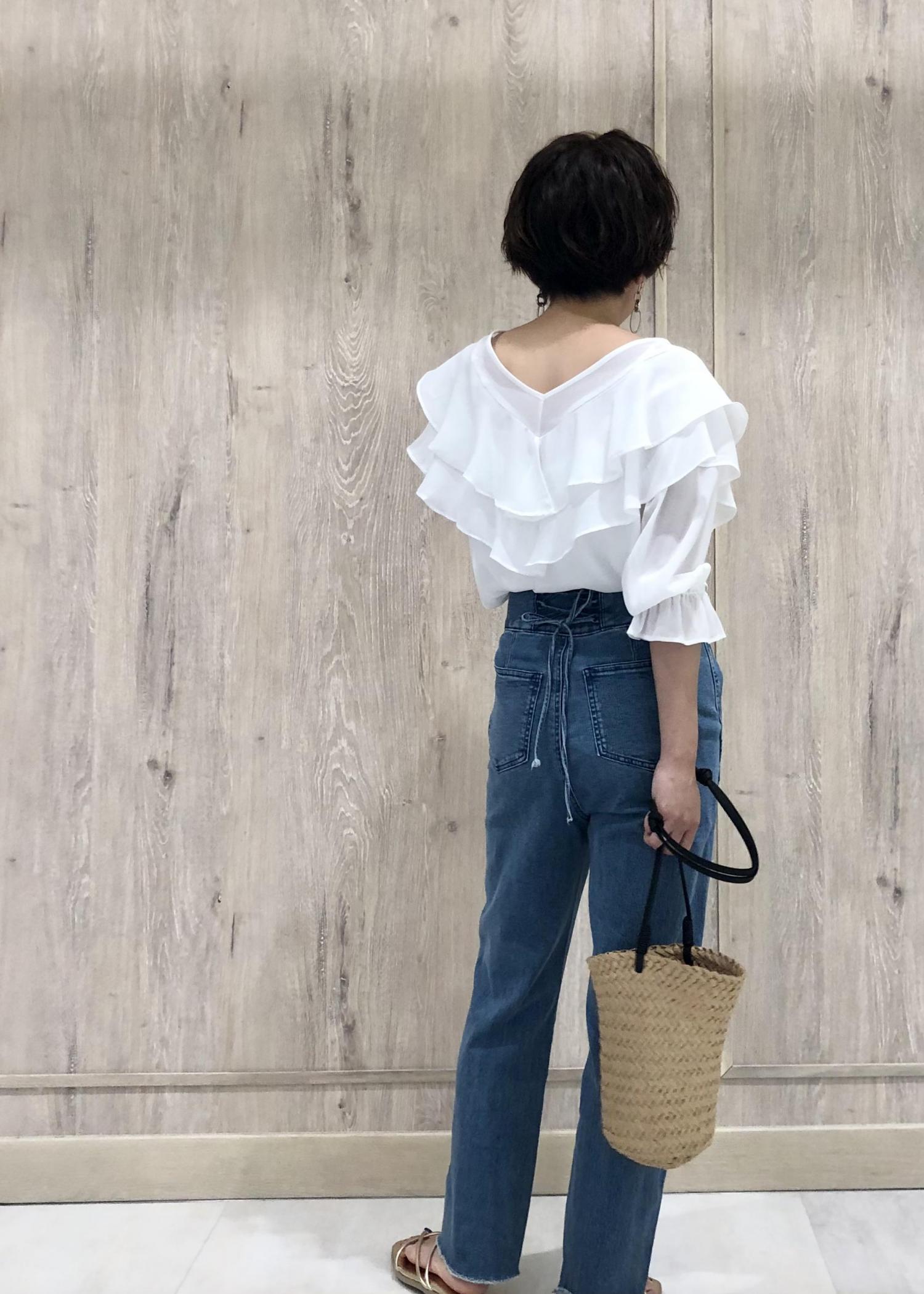 目を惹く甘めブラウスには カジュアルさを取り入れてデニム合わせに。 首元のリボンも結ぶと可愛くなるので あえて垂らしてフェミニンに抜け感を。