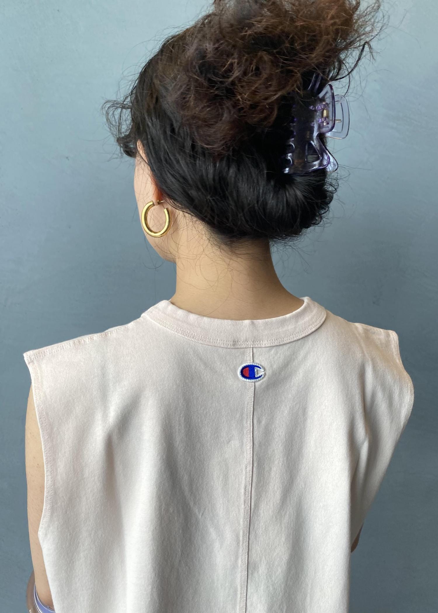 スタイリングが全体的にオーバーシルエットな分、髪はアップにしてすっきりさせてみました。
