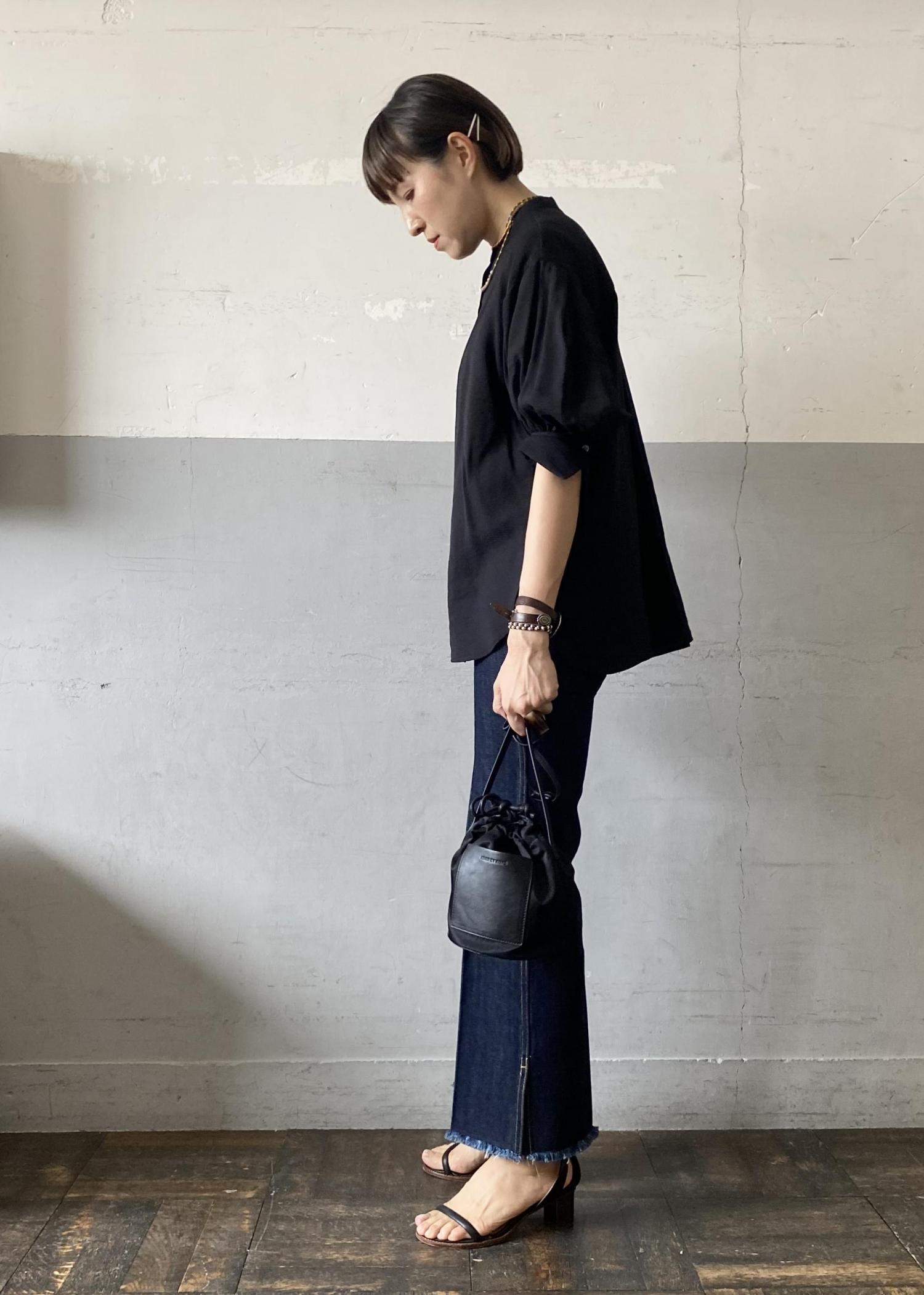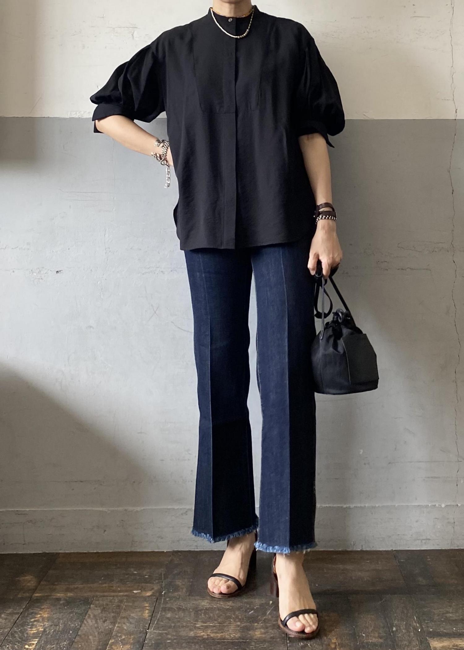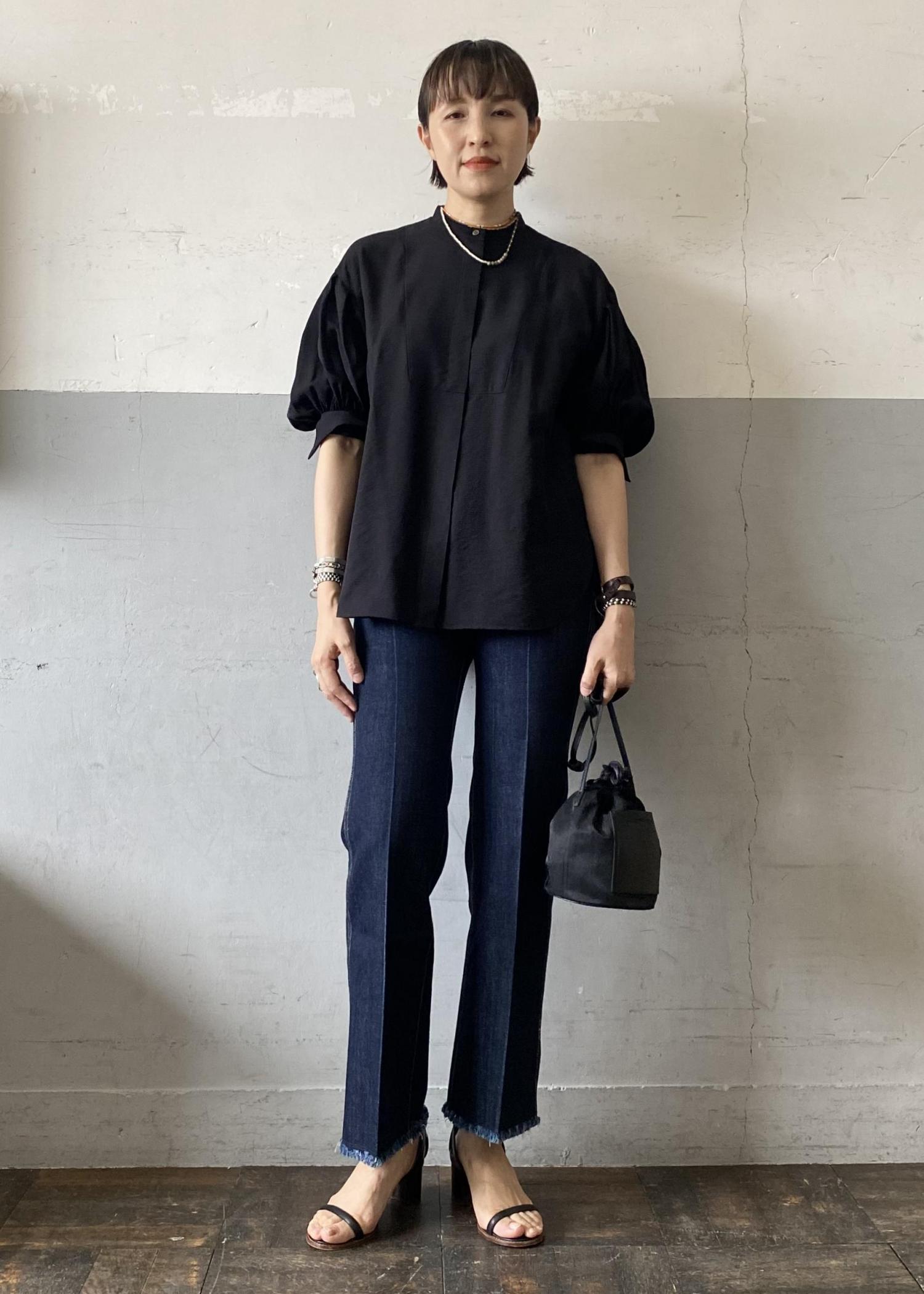 バンドカラーと胸の切り替えはブザムシャツのディテールを採用し、袖は今の気分にピッタリなボリュームのあるブラウスに。タックがたくさん施されており大きめのカフスがポイント。シアー素材はこれから暑い夏を乗り切るにはマストな存在!
