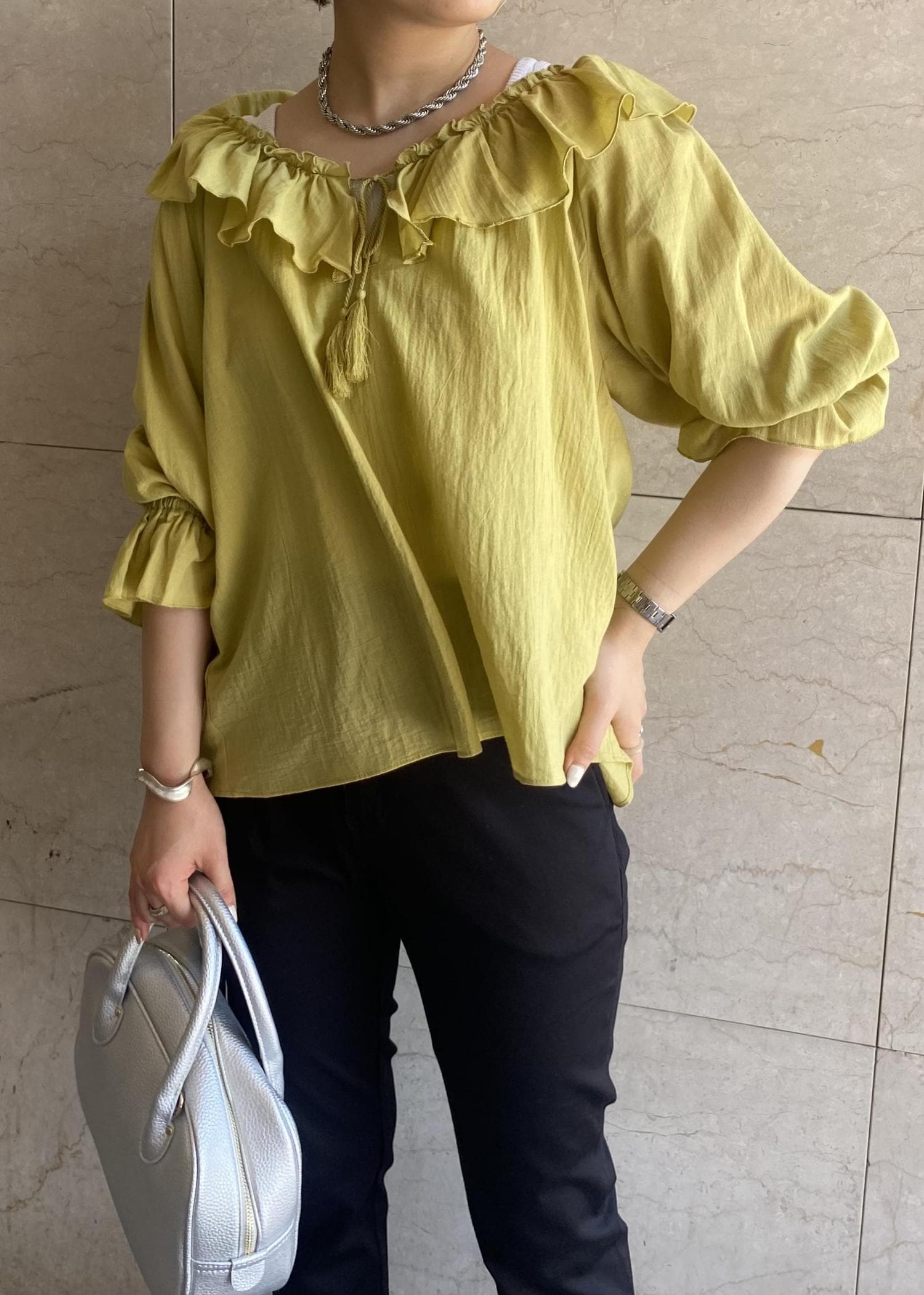 トレンドのフリルブラウス♪ 首元の開き具合は調節できるのも嬉しいです◎ 明るい黄緑のブラウスも ボトムスをベーシックなブラックにすると 派手にならずに着用できます♪
