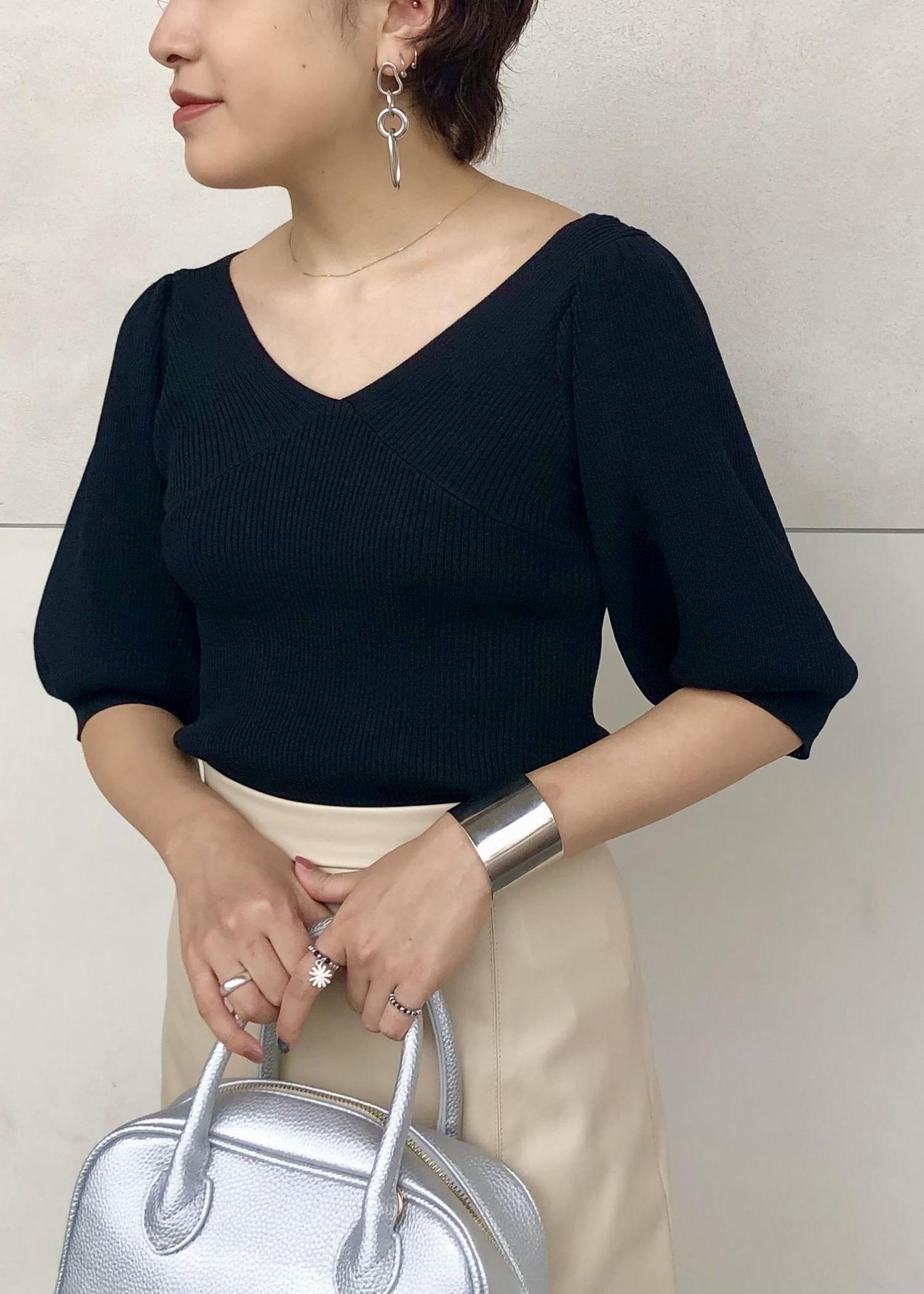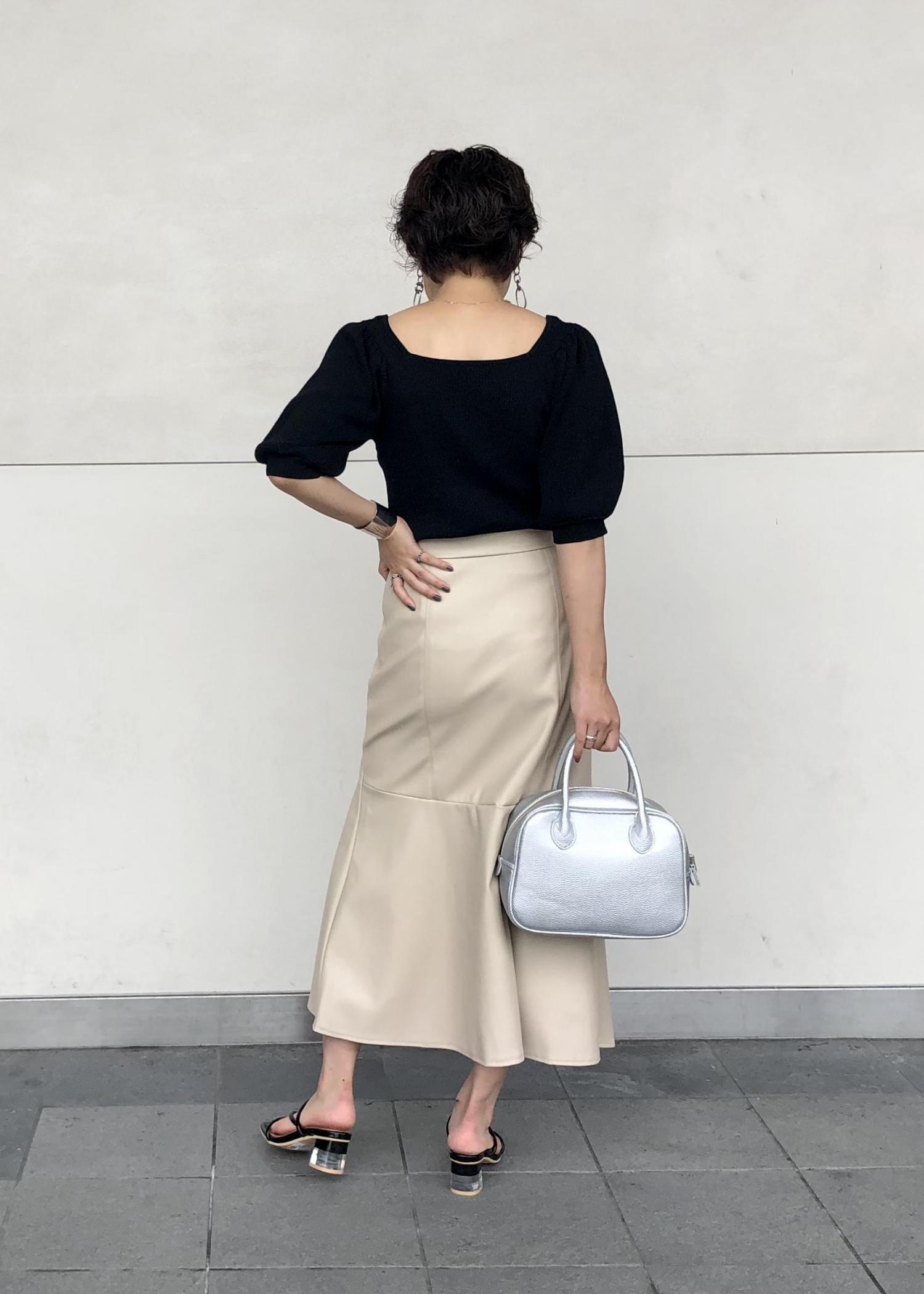 デザインサマーニットに マーメイドラインのスカートを合わせた ザ・シンプルな 王道フェミニンスタイル。 首元のスッキリ感とレザースカートを掛け合わせ フェミニンなんだけど、どこか芯の強さを思わせるスタイリングに。