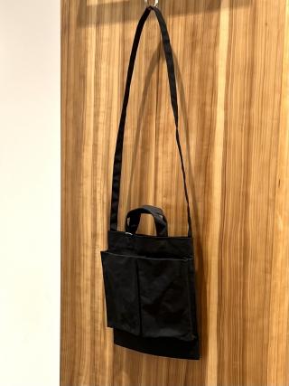 マイバッグが必需品となった昨今、野菜を入れるキャンバス地のバッグ “ベジバッグ”と、ミリタリーの定番 “ヘルメットバッグ”をモチーフに、新しく、どこか上品な印象のあるバッグを仕立てました。素材にはキャンバスではなく、強撥水をかけたコットンライクな塩縮加工ナイロンを使用し、キャンバスよりも汚れにくく、また、軽く、強度のある仕上がりです。
