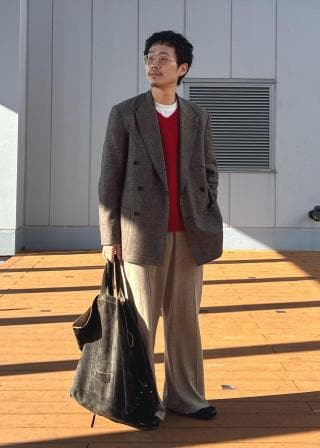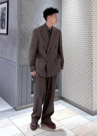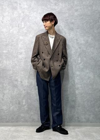 ボックスシルエット、ピークドラペル、ダブルブレストの形でとにかくかっこいいテーラードジャケットです。大きめなので私服使いしやすく、ちょっぴりカジュアルに寄っています。