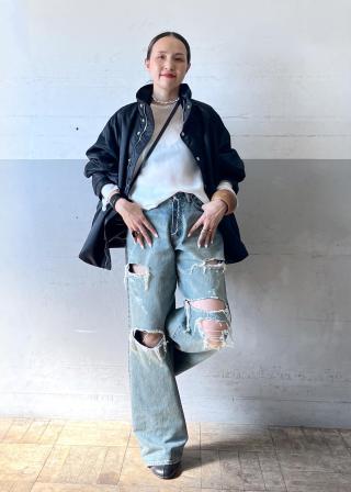 めちゃくちゃカッコいい色落ちとダメージ加工が特徴のワイドストレートデニム。ボタンフライが外から見えるデザインもオシャレです。普段はレディースサイズは38着用。メンズのパンツはだいたいMサイズを履きます。(Sサイズからの展開でもMサイズです)