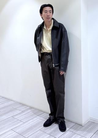 レザー調のデニムパンツ。表面コーティングがしてありレザーっぽく見えます。着込んでいくと味が出てきて、経年変化も楽しめます。下地の色が滲み出るように変化します。長めの丈感でゆったりと履けます。