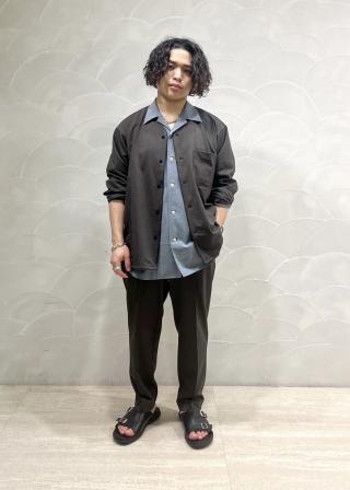 ジャージ素材なので、スニーカーやサンダルとの相性はもちろん、革靴でもコーデが決まるので足元を選ばない一着です。