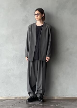 太もも周りはタックが入っていて余裕があり、テーパードがかかった綺麗なシルエットで、セットアップでの着用以外でも単品でもかなり汎用性の高いパンツです。