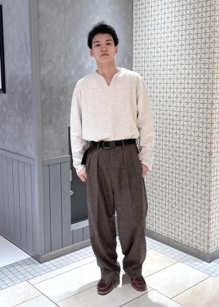 ラフなイメージのあるホームスパンですが、品のある感を表現するために、微光沢のあるレーヨンにウールを巻きつけたタテ糸を使用し、艶をプラスしています。