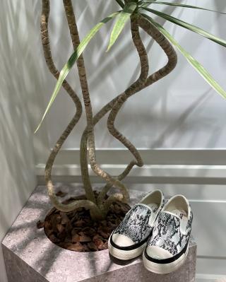今回、オリジナルのパイソン柄をU.S.ORIGINATORベースのオールスタースリップオンに採用し、クラシックな雰囲気に仕上げました。