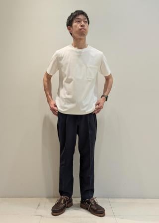 ボトムスも、イージーでありながら美シルエットなイージースラックス型で、くるぶしにかかる程度のアンクル丈に設定することで、革靴からスニーカー、サンダルやスリッポンまで合わせる靴を選びません。