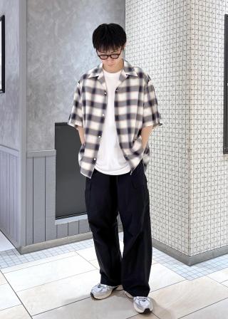 ゆったりとしたオーバーサイズシルエットで、チェック柄はアイボリーのような色を基調にブラウン・ネイビー・ベージュなどの複数の色の糸によって作られているURUらしい独特の世界観も感じられるようになっています。