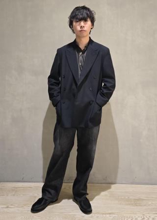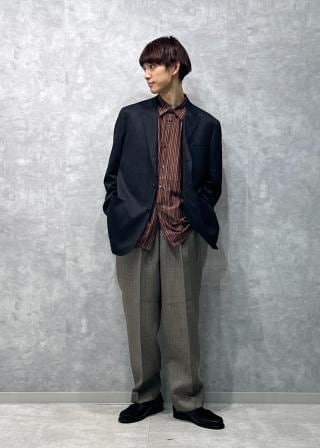 ディティールは、ドレスシャツを採用し全て巻き伏せ本縫い仕様、貝蝶釦使いです。