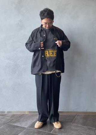 縫製はトレーニングスウェットをイメージし、 80'sのラグランスリーブボディをベースにフ ロントのリブ切り替えをアクセントに。