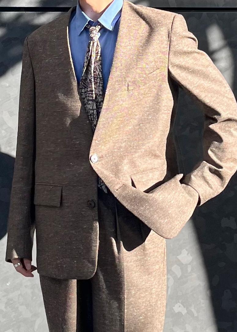 ノーカラーのジャケットのインナーにあえて襟付きのシャツ