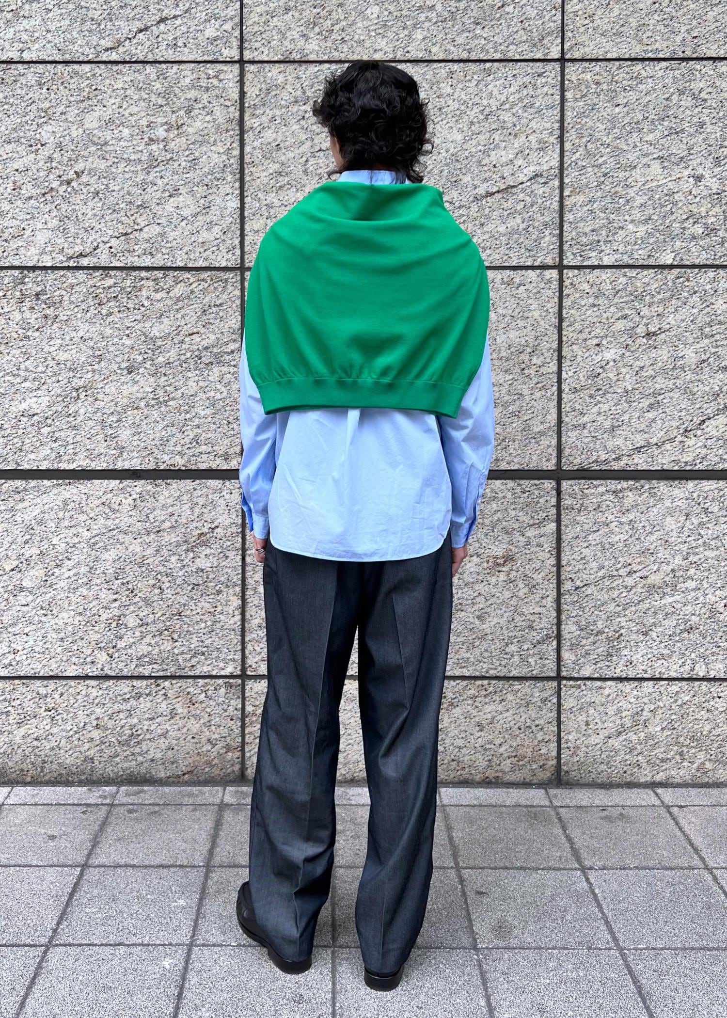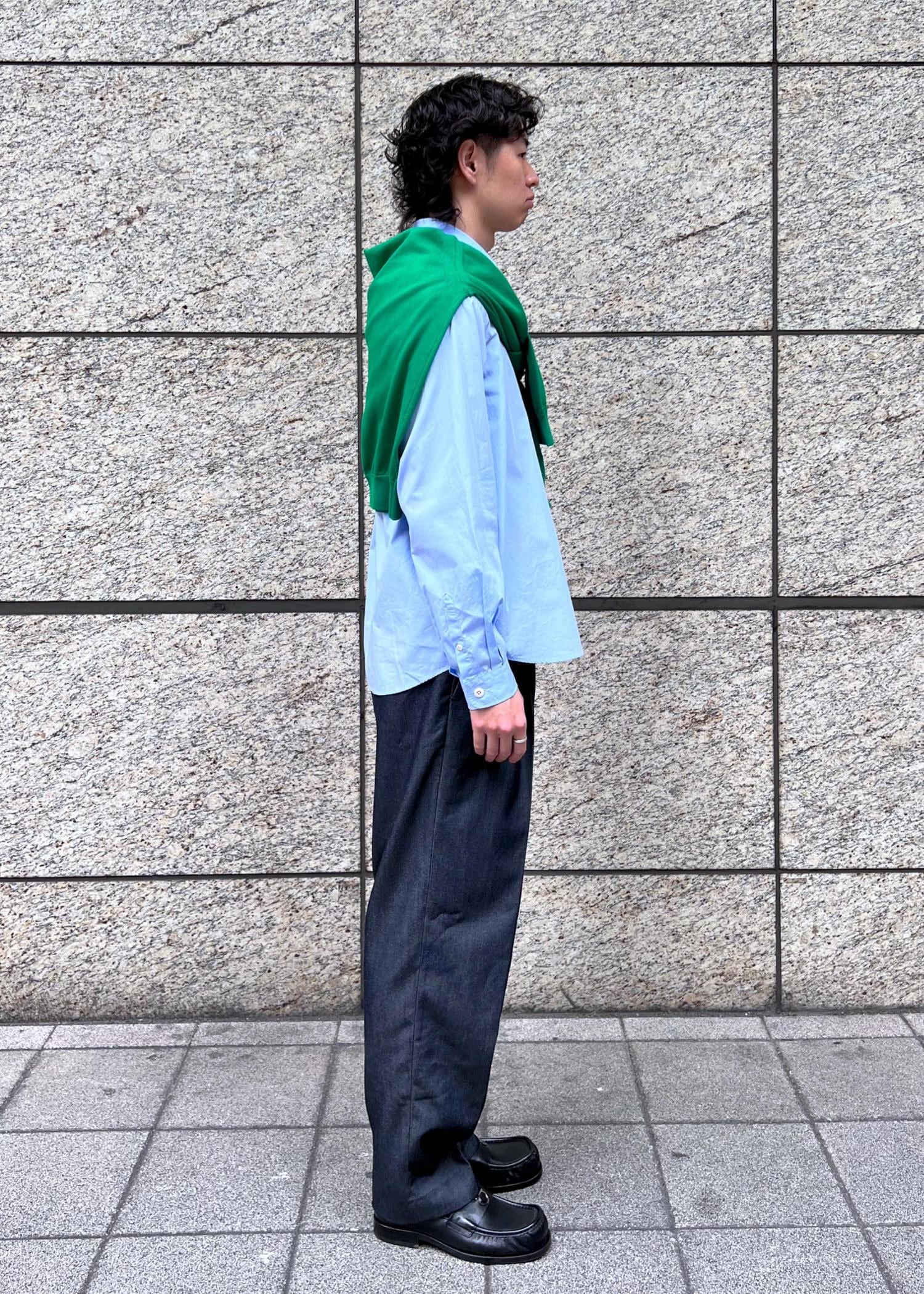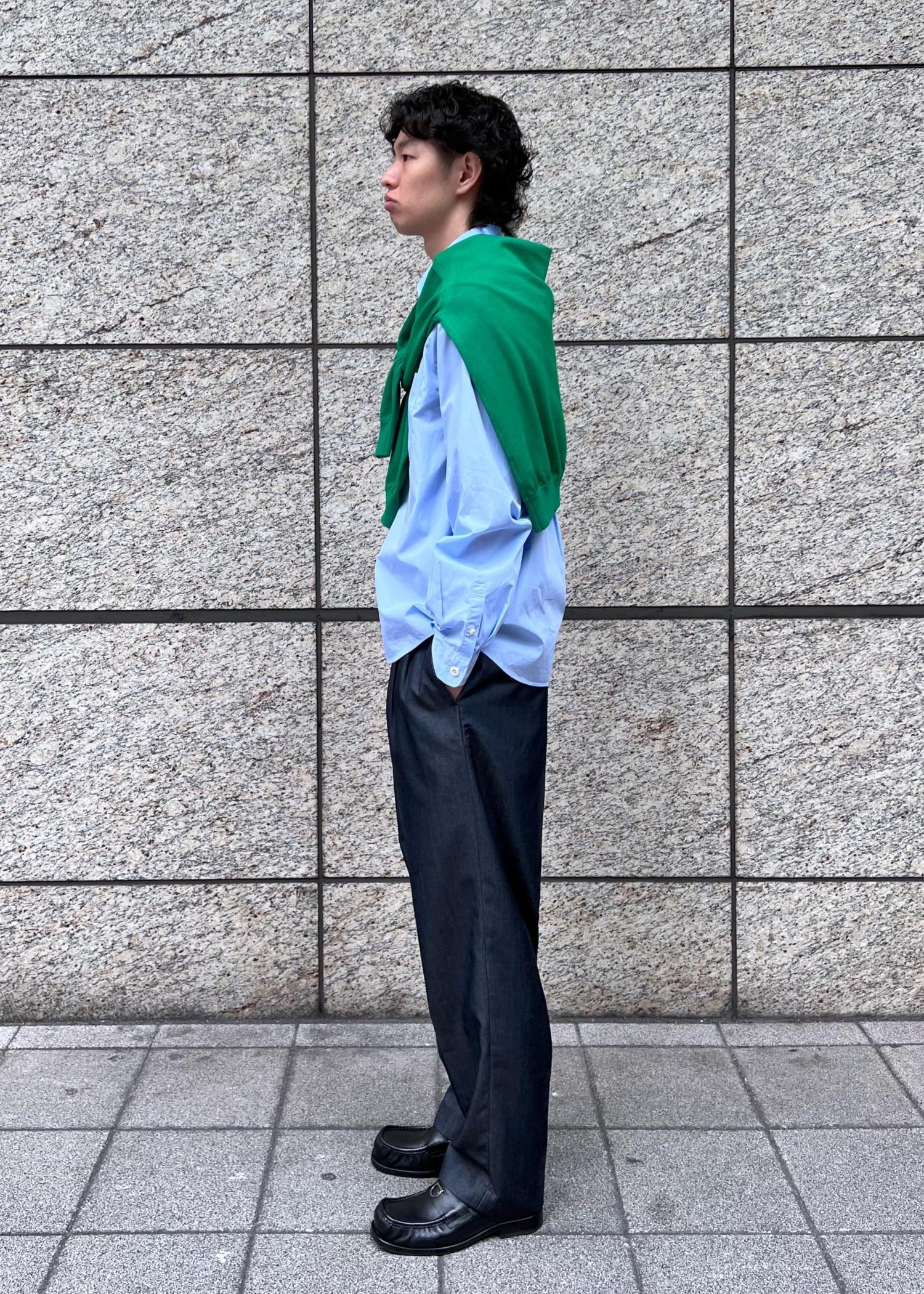 今回はサックスブルーのシャツをメインにコーデを組んでみました!シンプルなアイテムを上下に持ってきたのでグリーンのニットを肩から掛けて春らしい色味でかっこよく、キレイめに着ていただけると思います!