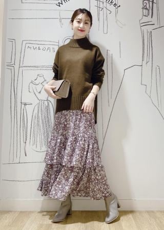 華やかで大人なイメージのエレガントさんはダークブラウンやパープルなど深みのあるカラーでスタイリングを締めて。花柄スカートもエレガントさんの品を引き立てるのにぴったり。