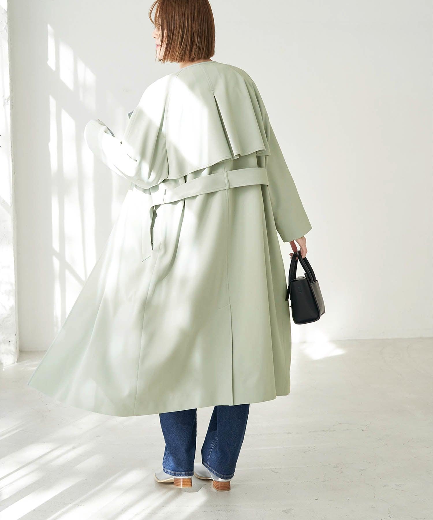嬉しい撥水・UVカット機能が付いた優秀アウター。ドライタッチで落ち感のある上質な素材が使用されていて、着心地も抜群!首元がすっきりするため、スカーフやストールを組み合わせても◎。ひらりとしたヨークが女性らしい後ろ姿を演出するのもポイントです。