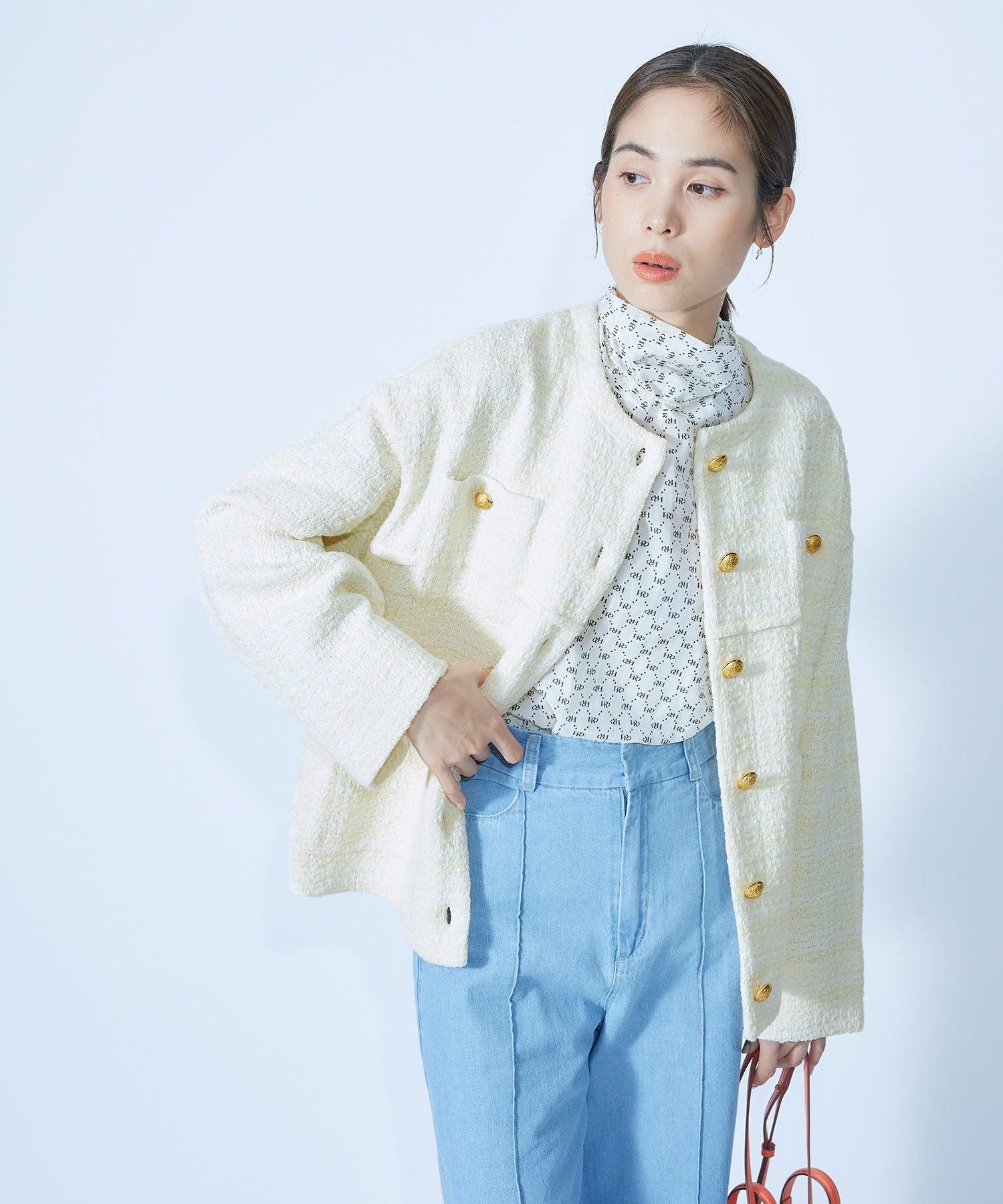 絶妙なサイジングで抜け感のあるニットツイードのクルーネックカーディブルゾン。今季はフェミニン系ブラウス+デニムや、フラワープラントプリントのボトムス合わせなど、オンカジュアルミックススタイルに合わせるとモダンな印象に。定番アイテムとシンプルに合わせてもこれ一枚で主役級に使える万能アイテムです。