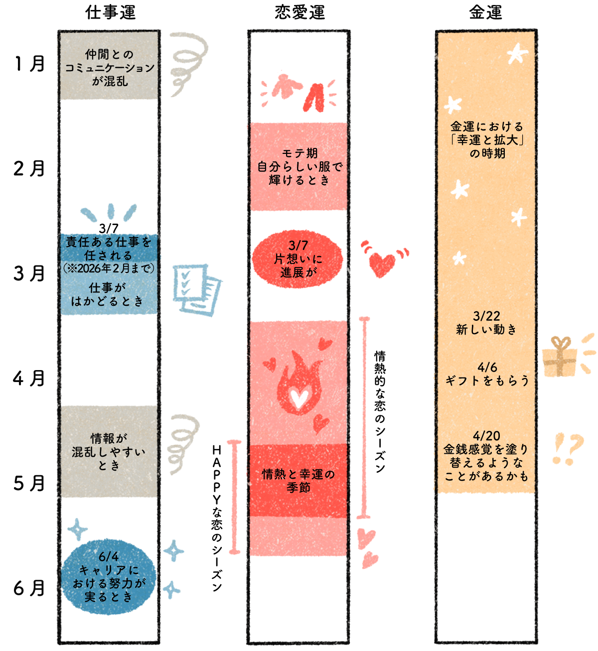 仕事運においてビビッドな動きは、なんといっても3月上旬に巡ってくる土星の影響でしょう。土星は2026年2月までうお座に滞在し、うお座さんを"鍛える"役割を担います。責任が重くなった、プレッシャーが強くなったといった感覚を抱く人もいるかもしれませんが、それは今後あなたが仕事をする上で、とても大切なスキルが育っている証拠。土星がもたらす試練は「乗り越えられる試練」とも言われます。長丁場の取り組みになりますので、急いで結果を出そうとしなくても大丈夫です。むしろ時間をかけたほうが価値がありますから、疲れたら休み休み、あなたのペースでやっていきましょうね。