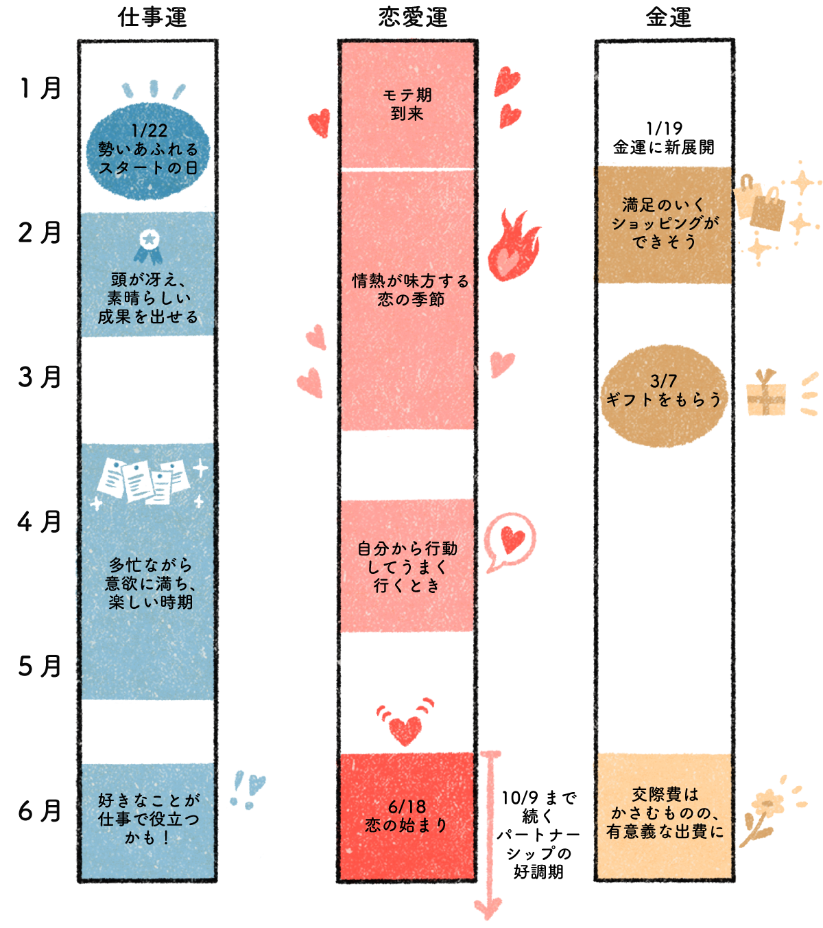 上半期で最もビビッドな流れは、2020年末にみずがめ座に巡ってきていた「制限と試練の星」と呼ばれる土星が、3月上旬にみずがめ座を抜けていくことです。土星はそのときどきに、生きていく上で欠かせないレッスンをしてくれる厳しい先生のような星。非常に意義のある日々ではあるのですが、そういったことは、すべてが終わって過去を振り返るときに考えられること。渦中にいる間は「しんどい」と感じることも多々あるのですね。そうした土星が3月上旬に去っていくことで、少なからずホッとする人は多いでしょう。そして、少し成長した自分とともに、恋や仕事を自分らしく楽しんでいけるのが、この上半期だろうと思います。土星は今後、みずがめ座の金運を鍛えていきます。堅実・倹約が意識にのぼってくる人は多いはずですが、ケチになりすぎてもつまらないもの。必要なものとそうでないものを、丁寧に考えていけると素敵です。6月は、まさにそうした金運のタイミングです。