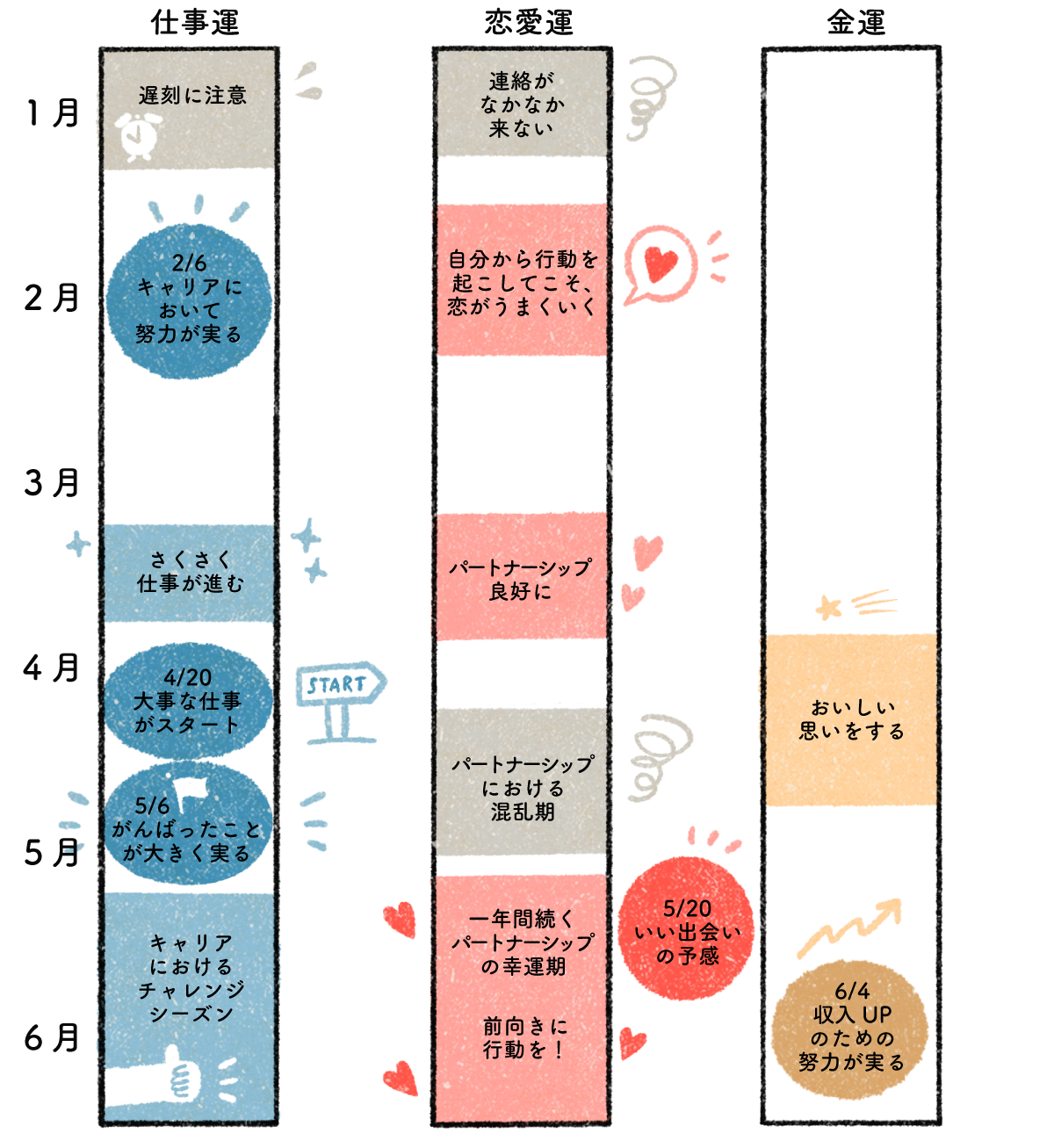 5月中旬より前までは、パラパラとバラエティに富んだ幸運のタイミングがある印象です。1月と4月〜5月にかけて混乱期がありますが、これはどの星座にも共通に起こることなので、あまり心配しすぎないでください。さそり座さんにとっては、コミュニケーションに直接影響をもたらす星回りとなるので、強めに混乱を感じるかもしれまんが、時間が解決するものでもあります。どうぞ、落ち着いて行動を。
