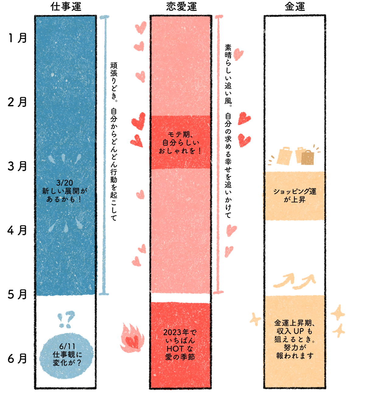 2023年上半期、「幸運と拡大の星」と呼ばれる木星がおひつじ座に巡ってきます。ここでの「幸運」は、待っているだけで降ってくるような幸運ではなく、「自分から行動を起こすことでチャンスが拡大し、幸運を手にすることができる」というもの。仕事運、恋愛運においては5月中旬まで、あらゆる面で前向きにチャレンジしていくといいでしょう。金運については、5月中旬からが本番。ここでの金運は人からもらうものではなく、自分で努力をした結果、手に入れるものです。おそらくですが、5月中旬までに仕事で頑張った人は、その結果として収入アップにつながるのだろうと思います。