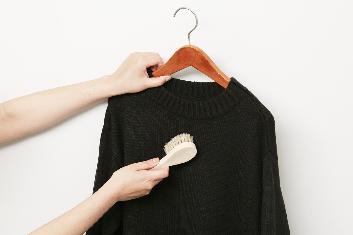 ・すぐにタンスに片付けずに、肩の部分に厚みのあるハンガーに一時的に吊るし、ニット専用のブラシで埃を落とします。
