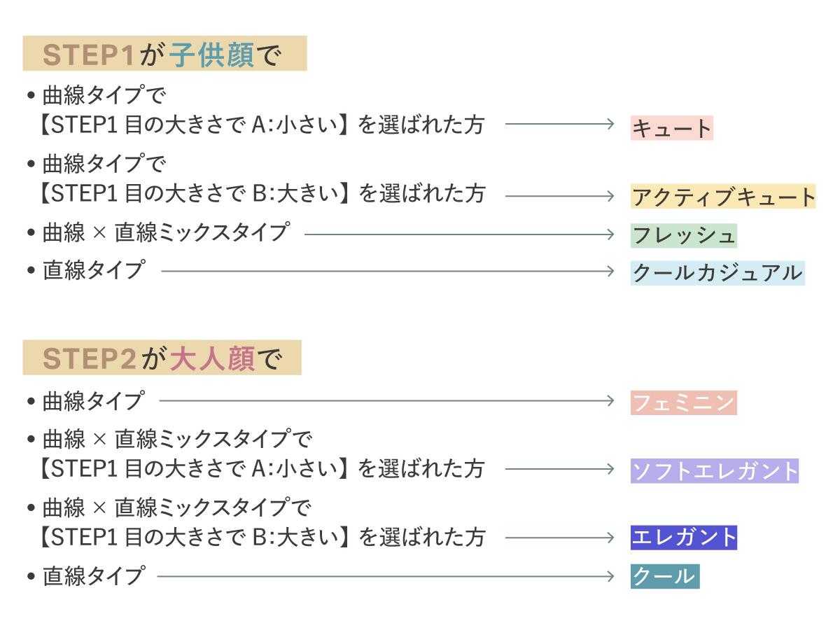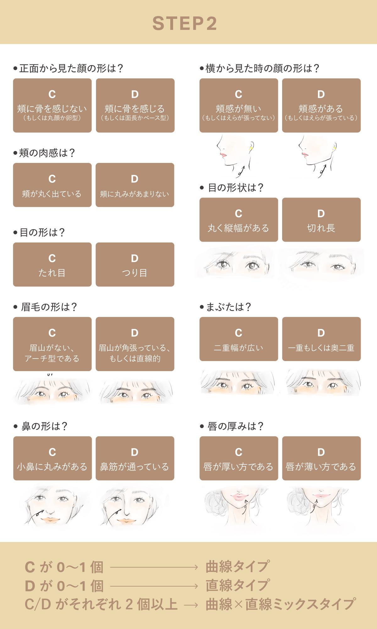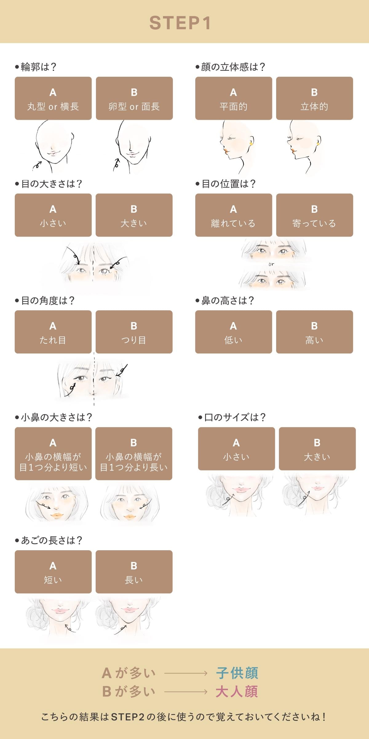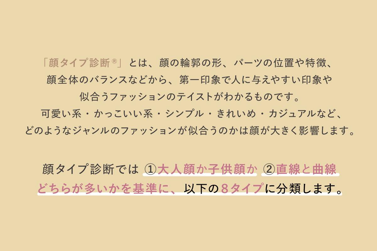 「顔診断」とは顔の形、パーツの大きさや形、それぞれのバランスなどから自分の顔の印象をタイプ別に診断できるツール。