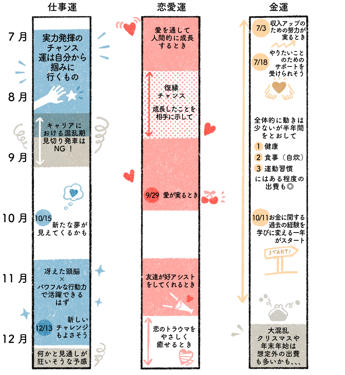 仕事は前述の通り、完璧主義からいい仕事ができる予感です。7月から8月にかけてはキャリアにおいて、本気の挑戦をすることになる暗示も。