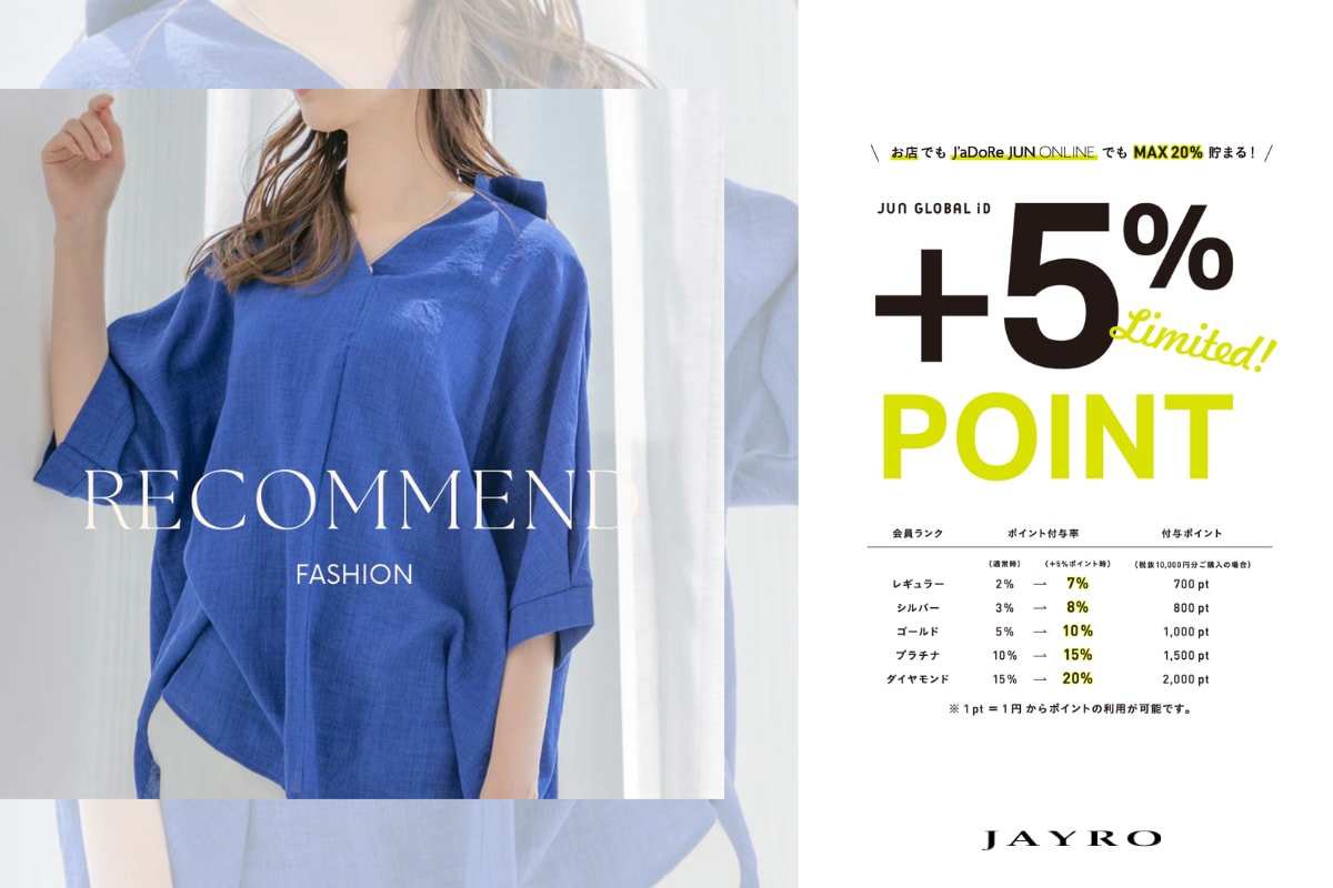 期間中、通常価格のアイテムお買い上げの金額・ランクに合わせてグループにてご利用いただけるJUN GLOBAL IDのポイントをプラス5%アップでプレゼント。