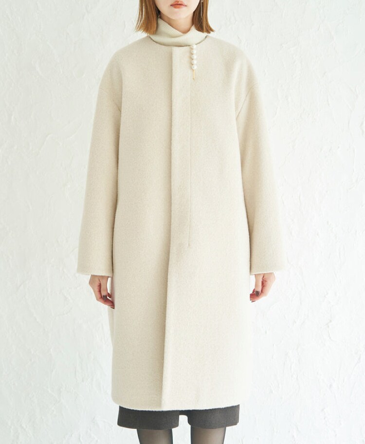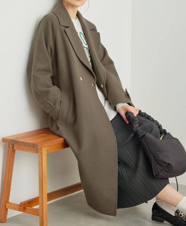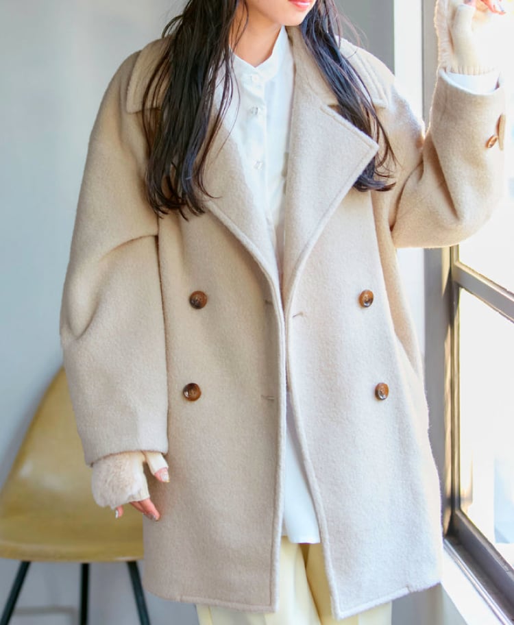 ミドル丈のコートを持っていないので、こちらのコートを自分へのご褒美に選びました。このコートはPコートとしてはもちろん、スタンドカラーとしても着れるので、その日のスタイリングに合った着方を楽しめるのが嬉しいです!素材もふんわりと包み込まれるような柔らかい生地で、なんと言ってもこの淡いベージュが大好きなカラーでツボでした♡