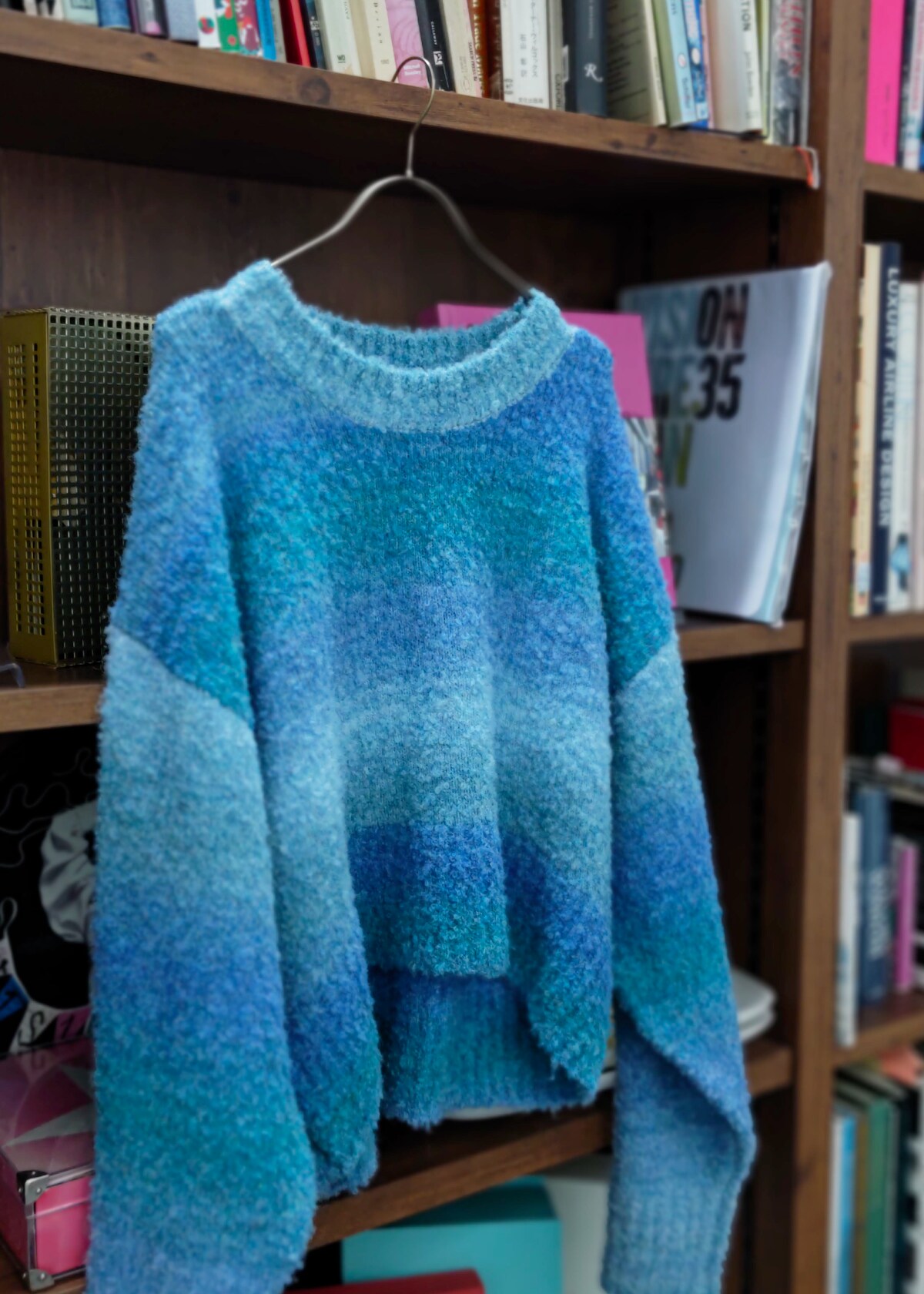いつも遊んでくれる友達にグラデーションニットをプレゼントしたいです。友達も私も海が大好きなので、綺麗なビーチを連想させられるようなブルーカラーを選びました!ふわふわでボリューム感あるシルエットが可愛く、奥行きのある色味が上品。この一年たくさんお世話になったお礼の気持ちもこめて♡