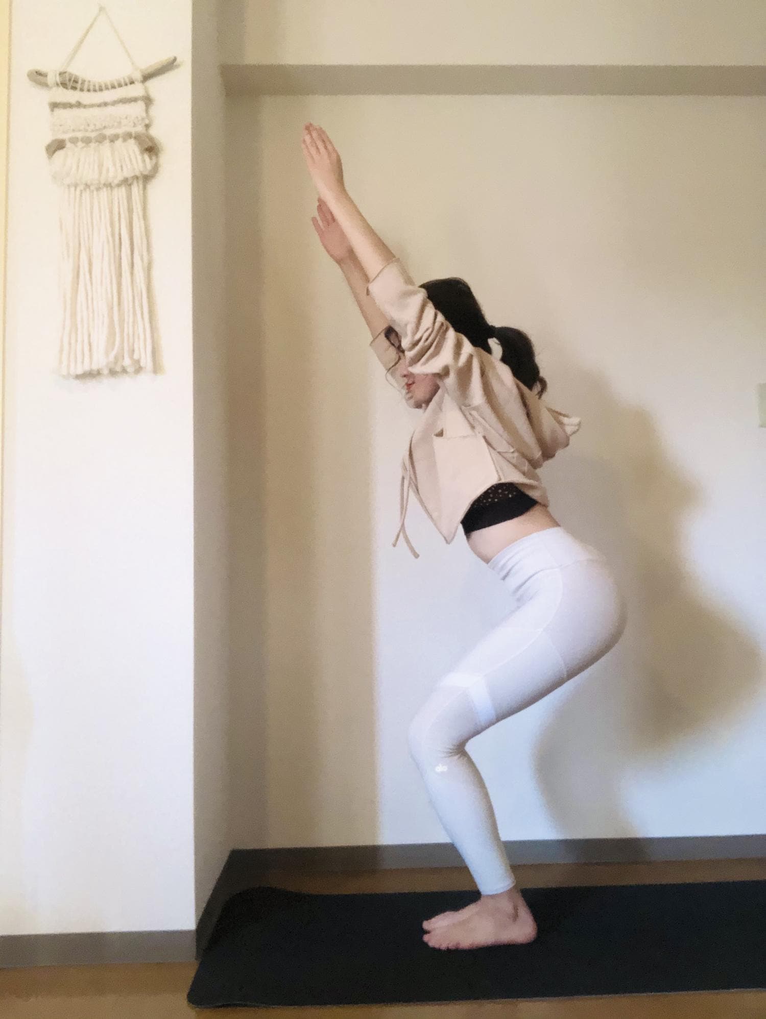 手をあげているチェアポーズは、見えない椅子に座っているようなポーズです。
