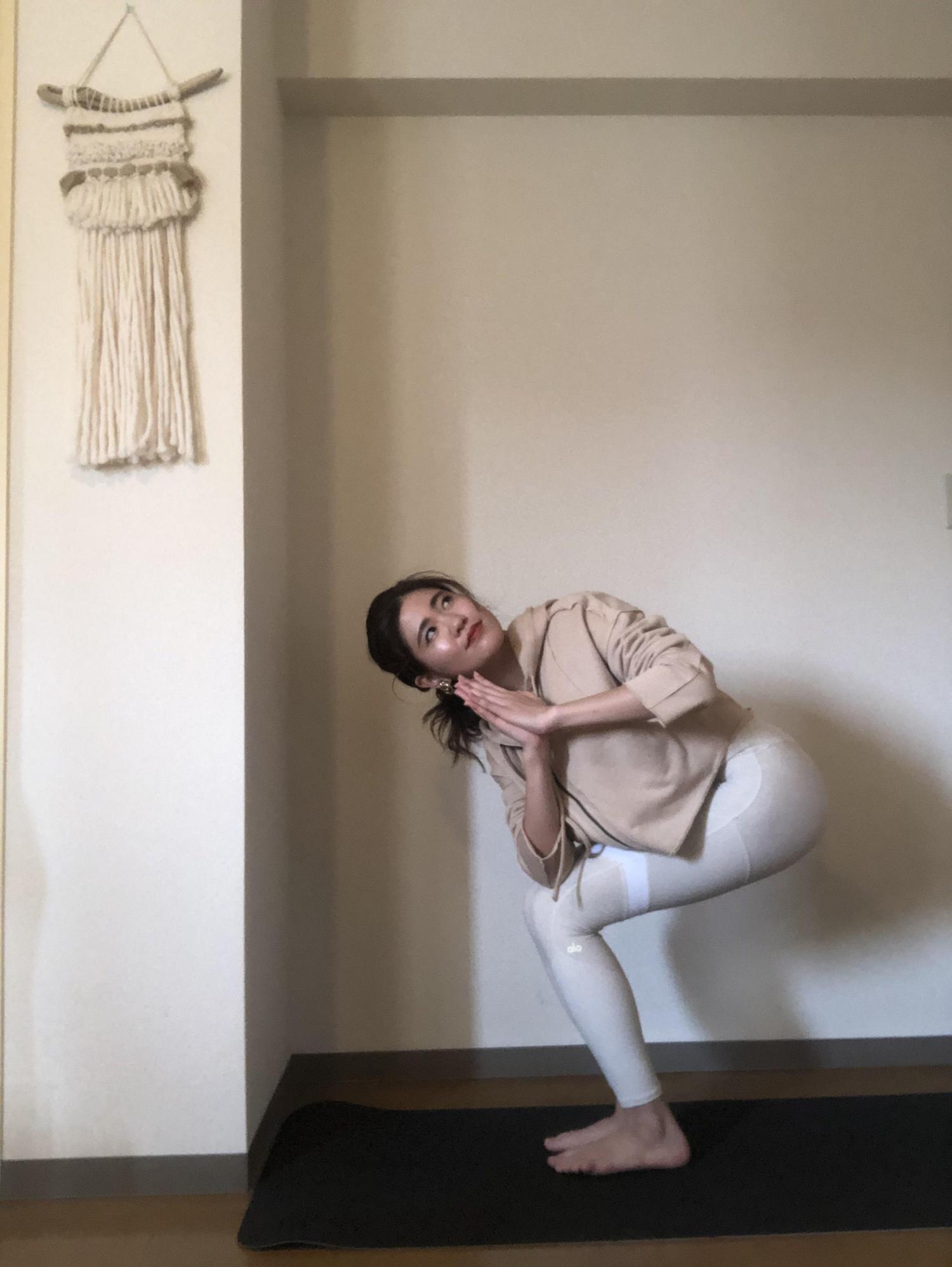 チェアポーズのまま、手を胸の真ん中で合わせて上半身をねじり、ツイストします。ツイストをすることでよりお腹に力が入り、身体の中の内臓に刺激を与えることで働きを高めることができます。