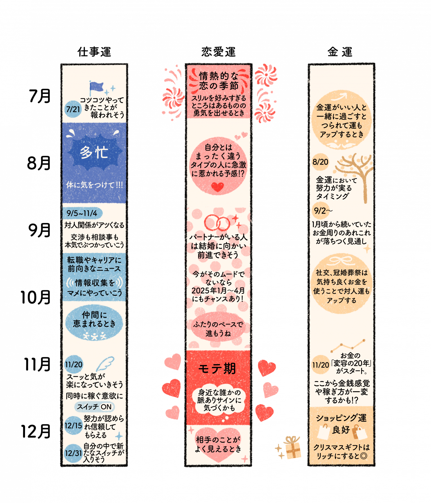 徒労と感じられるようなこともあるかもしれませんが、この時期の頑張りは、見てくれている人が必ずいます。いわば信頼の貯金をしているようなもの。おそらく、2025年6月中旬以降にその信頼が役立つかたちで幸運が巡ってくるはずです。体に気をつけて、ときどきはしっかりお休みを取って、お力を尽くしてみてくださいね。