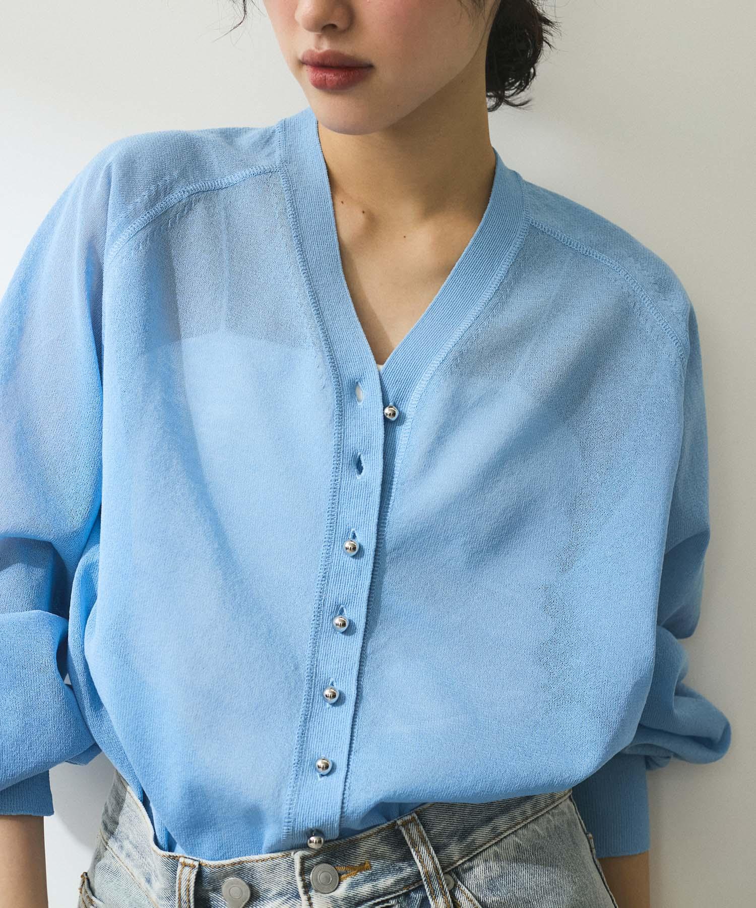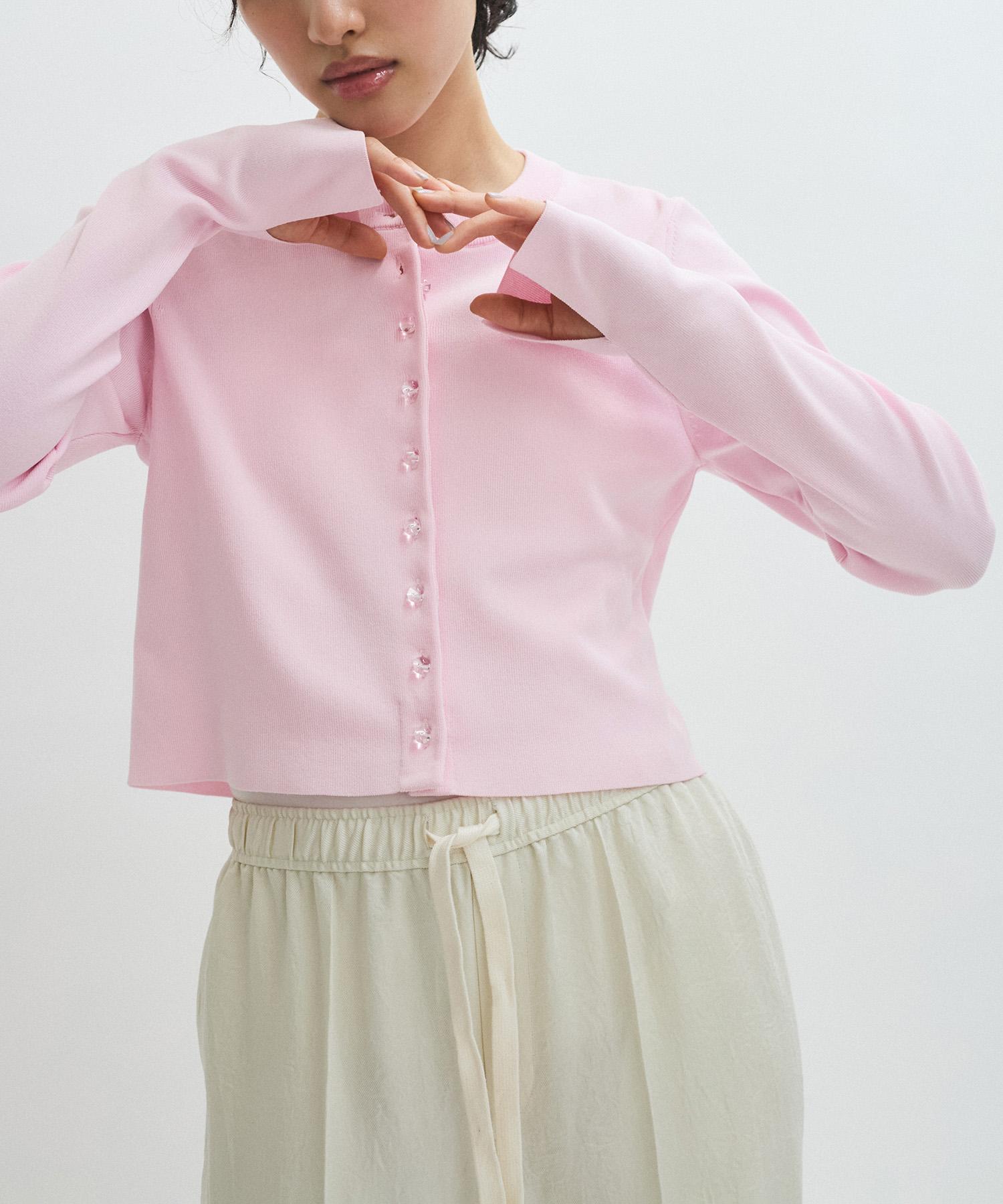 清涼感のあるクリアボタンとコンパクトなシルエットが魅力。ひんやりと快適な肌当たりが心地良いロングスリーブカーディガン