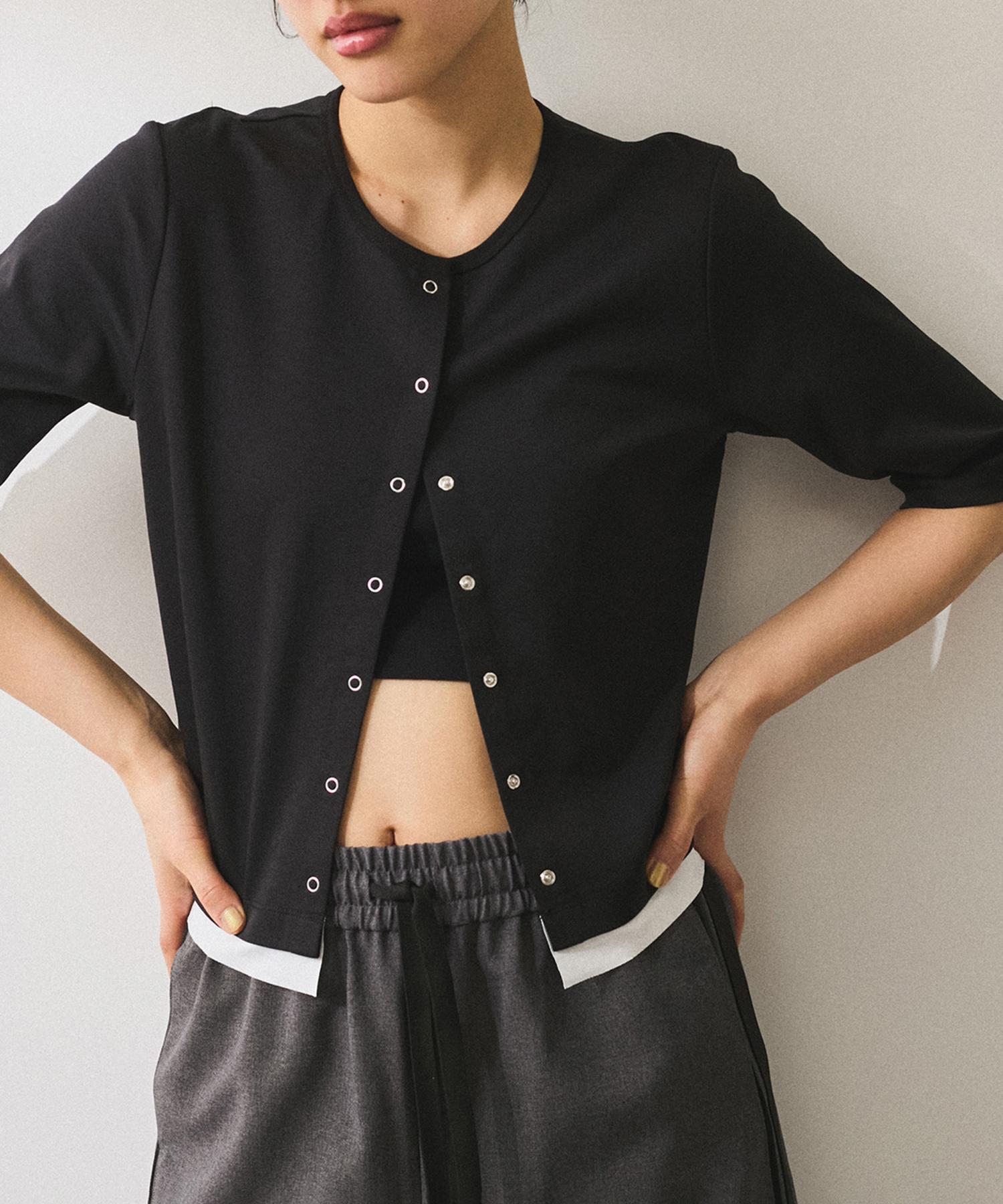 小ぶりなドットボタンがさりげないアクセントに。シンプルながらディティールにこだわった、Tシャツとしても着映えるカーディガン