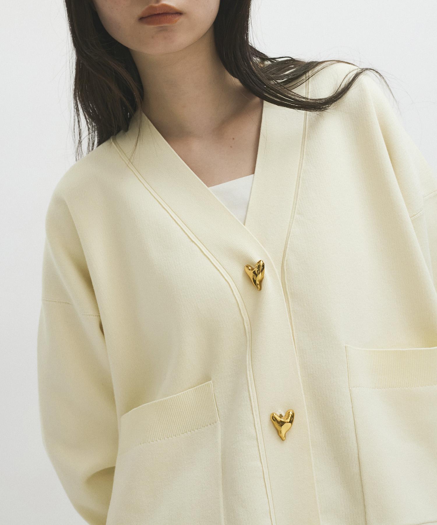 変形のハートボタンがフェミニン過ぎず大人っぽいカーディガン。リラックス感のあるワイドシルエットで着心地もGOOD。