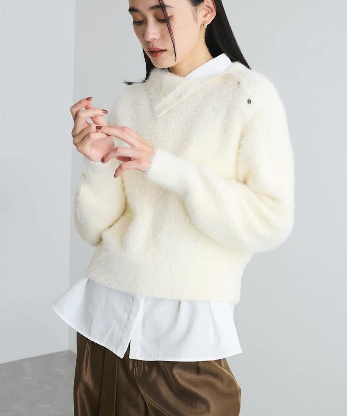 ミニ丈フェザーを織り混ぜたニット素材が柔らかなプルオーバー。カーヴィーなフォルムとメタルボタンの衿がデザインポイント。