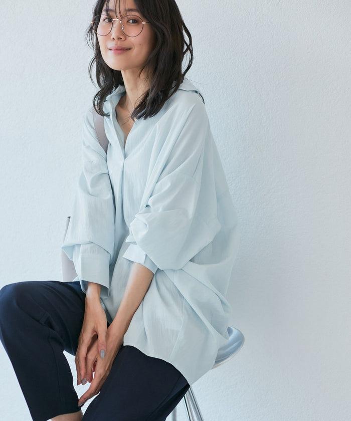 女性らしい落ち感で見せるとっておきのイージーシャツ。ほんのりとした透け感と、首もとの抜け感が女性らしさを引き立てる一枚。 ボトムスイン・アウトどちらのスタイルにも対応します。