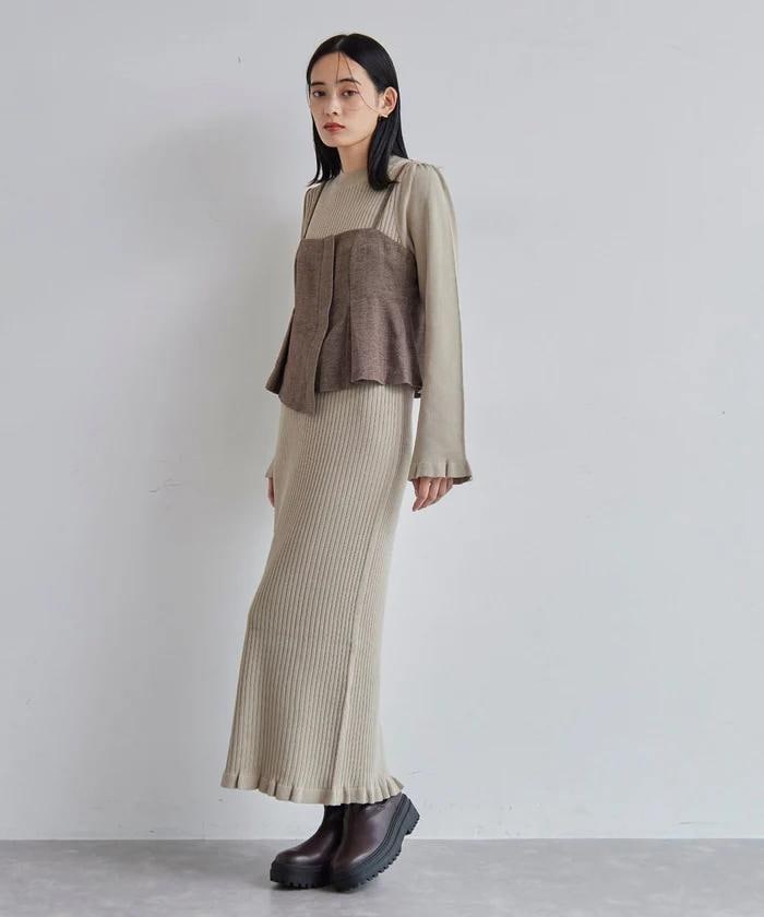 ビスチェとワンピースのセットアイテム。足元にはスニーカーなどカジュアルアイテムでアクティブなスタイリングも◎ 綺麗めなブーツやバッグでフェミニンコーデを満喫するのもおすすめです。