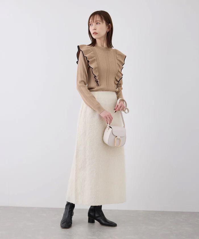 ホリデーシーズンにも映える華やかさを持ったフェザースカート。フェザー調のフリンジにラメが入った可愛らしさがありながら、バックスリットで着心地よく着用いただけます。