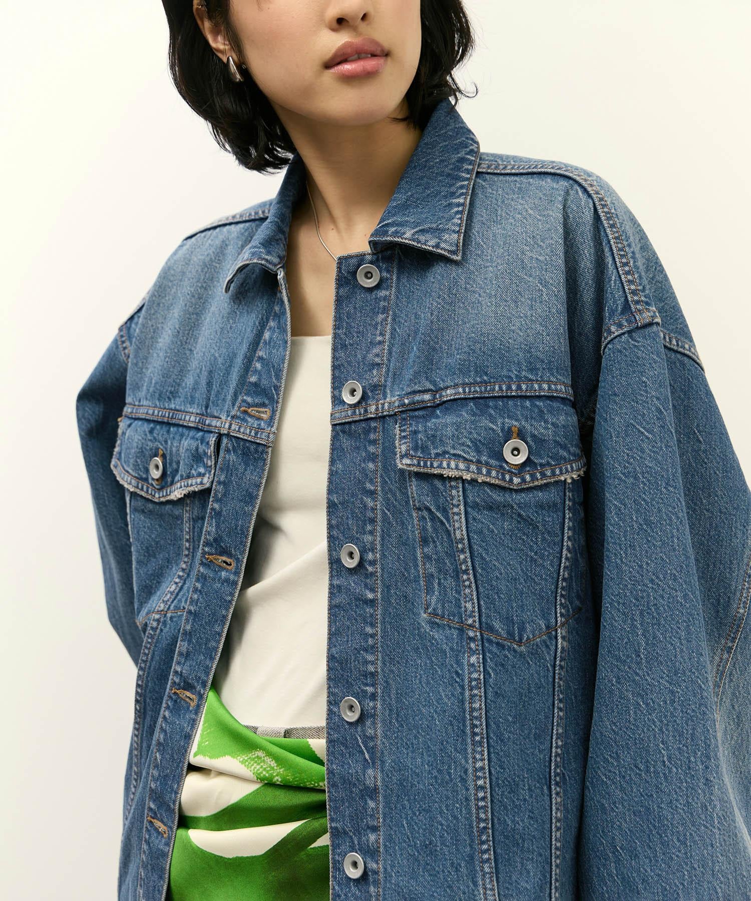 シャツライクなディティールを落とし込んだGジャンが登場。オーバーサイズのシルエットが余白を活かし、立体感と女性らしい柔らかさを演出してくれるデニムジャケット