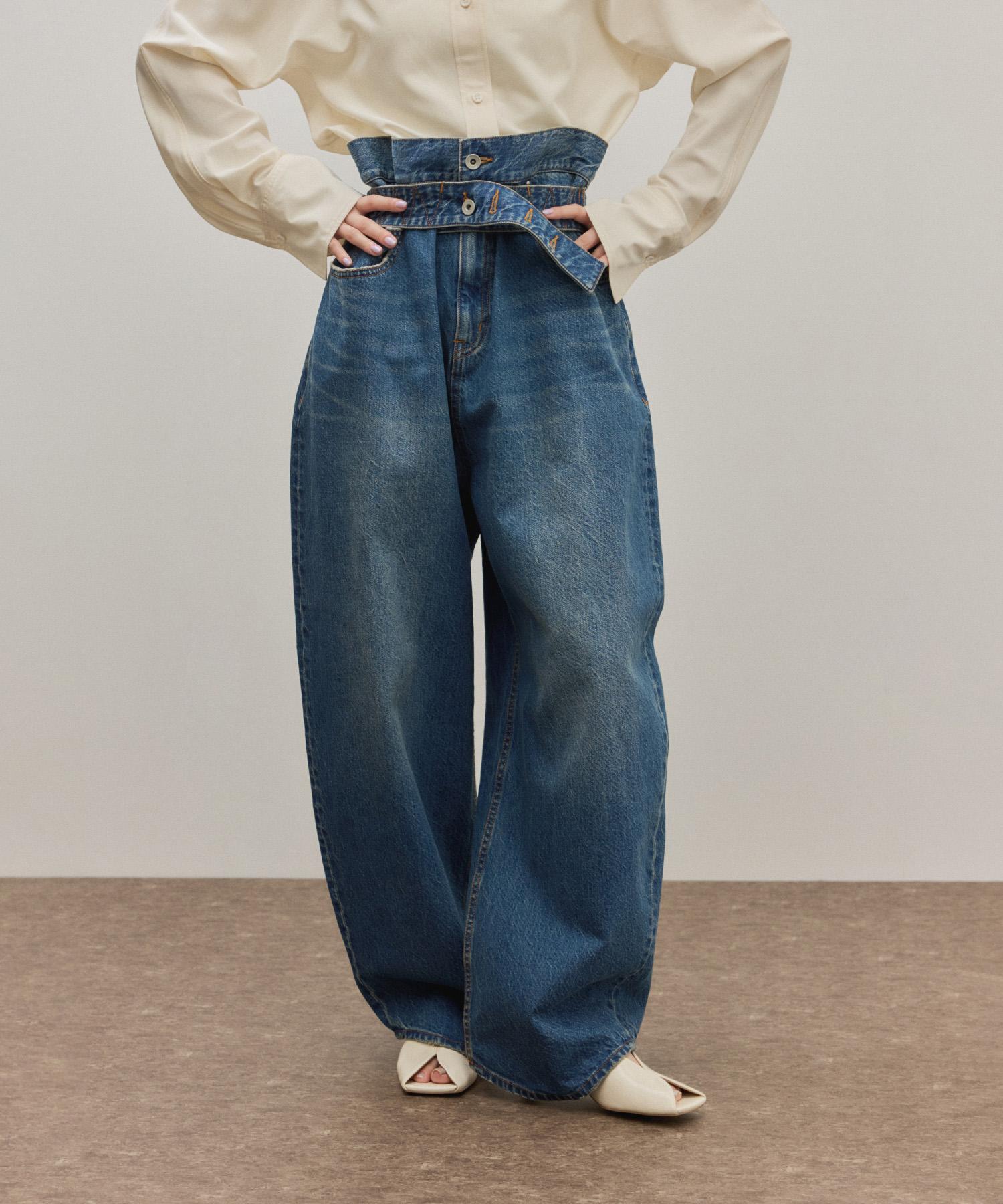 他にはないタブベルトデザインと美しいシルエットで様見え。気分によって前後で違った雰囲気が楽しめる、今旬映えること間違いなしのバレルシルエットデニム