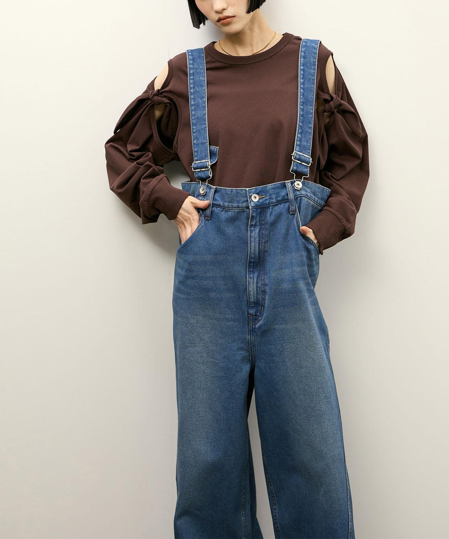 その日の気分で表情を変えられる、遊び心を欲張れる魅力的なデザイン。ゆるやかなカーブを描くワイドシルエットが存在感を放つ、主役級デニムサロペット