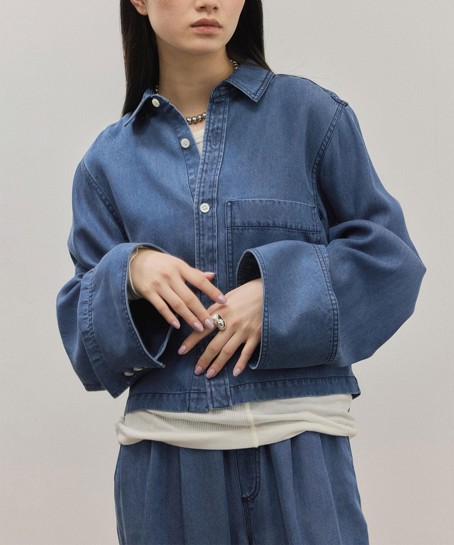 華奢見えするコンパクトな丈感に、ゆったりとしたワイド袖が今っぽく格上げ。柔らかな落ち感が描く、美しいシルエットと身軽さが魅力的なライトデニムシャツ