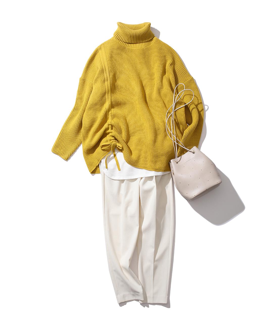 黄色=貴色、喜色ともいわれるイエロー。イエローのトップスに白ボトムあわせでクリーンな印象に!