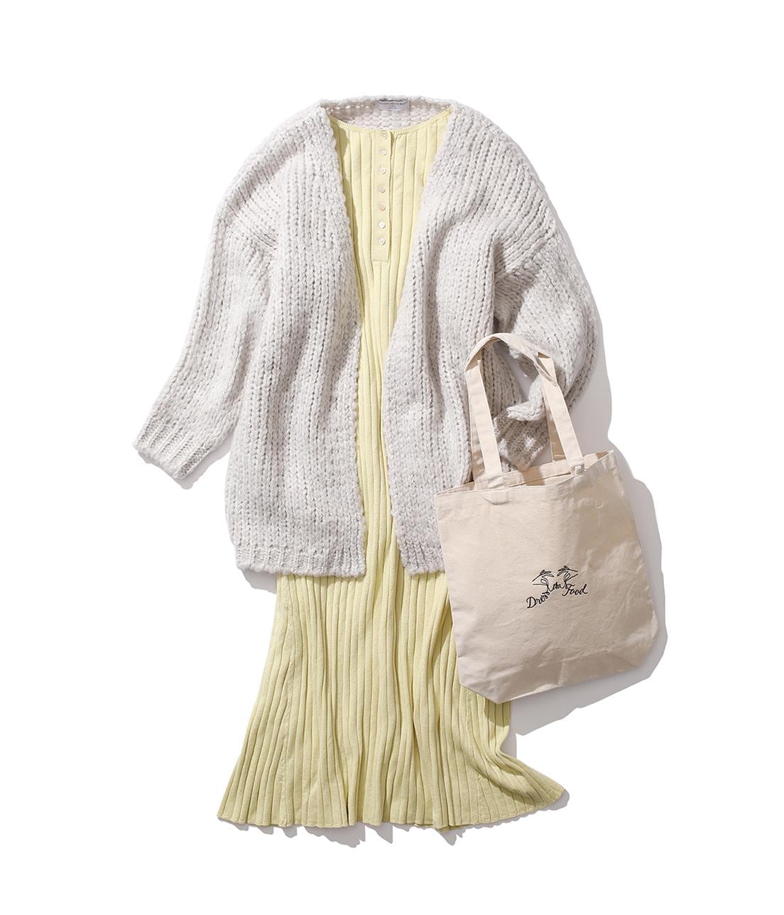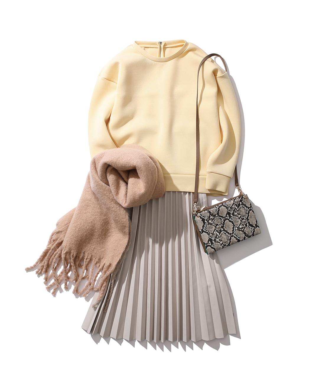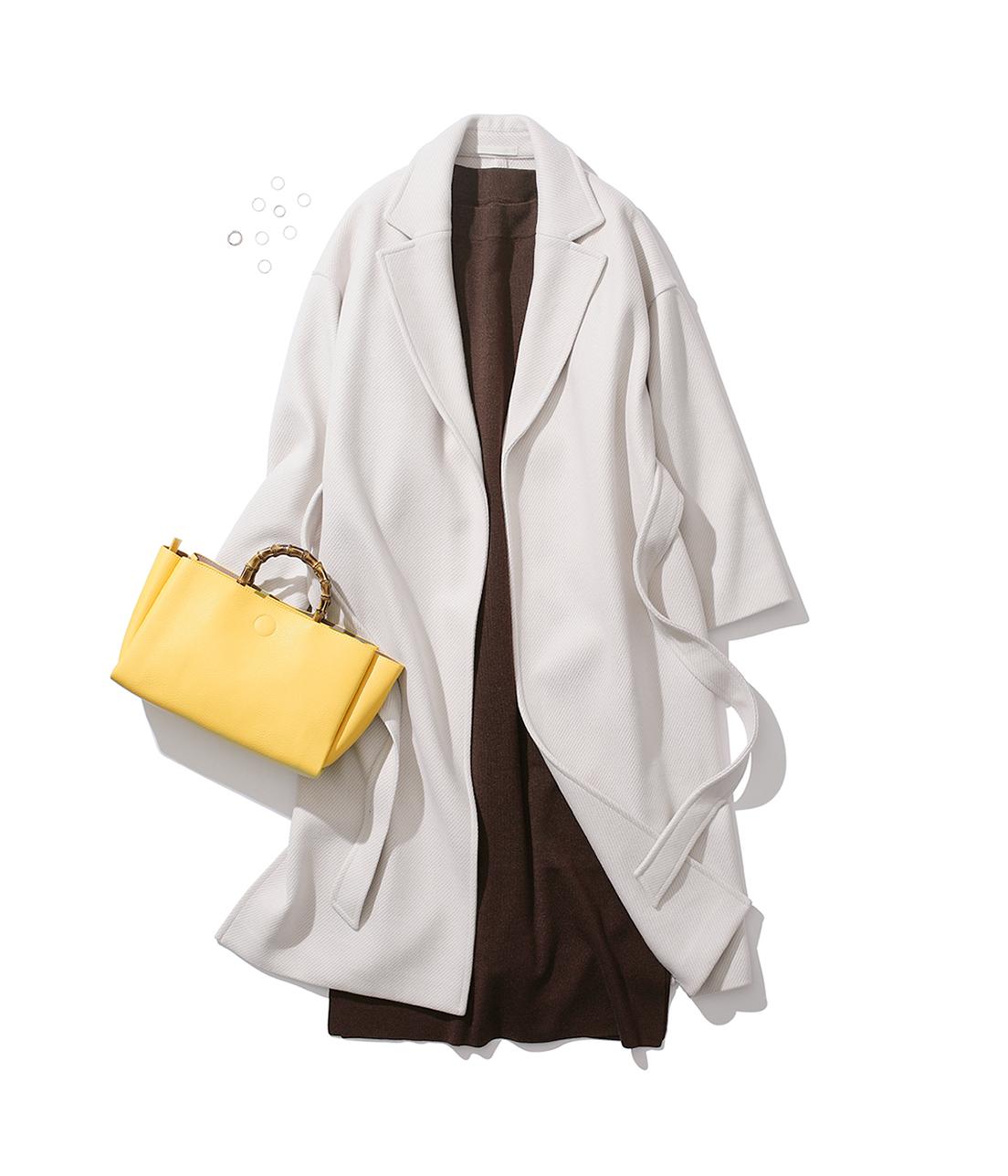 コート付き!上品なスタイリングの中にイエローの差し色がこなれ感アップ。