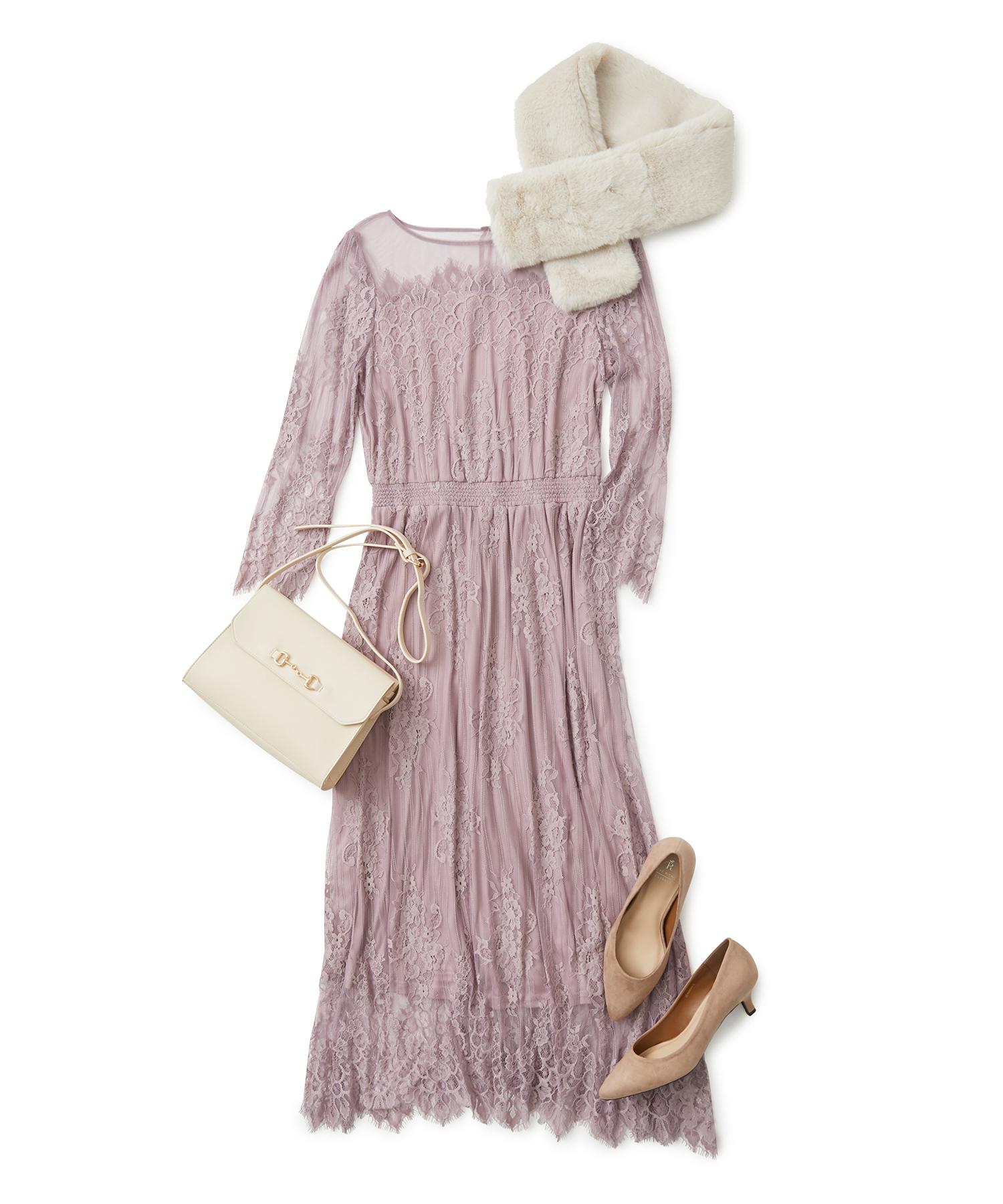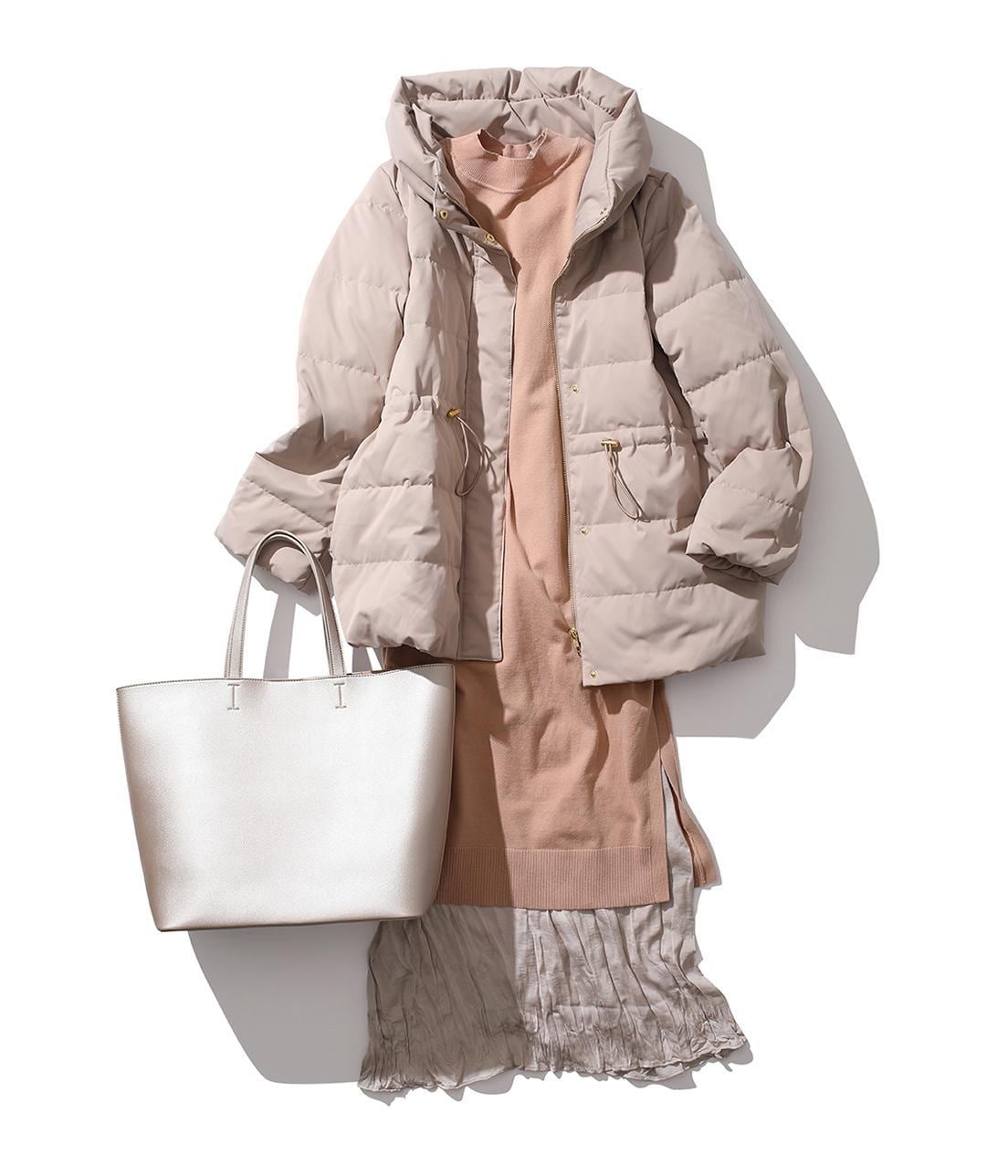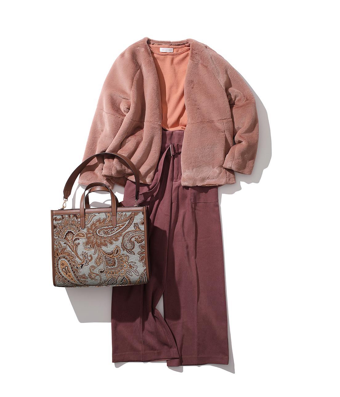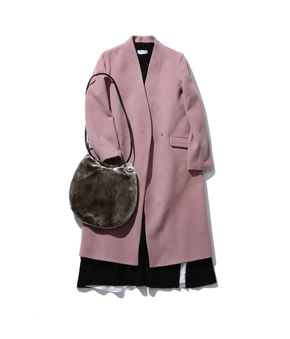 コート付き!顔色の明るく見えるカラーのコート、中は濃い目でモードに。ファーバッグはコーデの格上げアイテム。