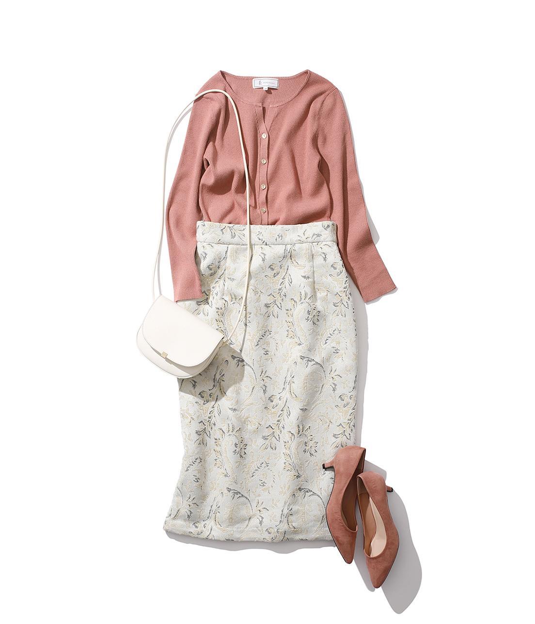 華やかな印象のスカートには淡いピンクのカーディガンとパンプスで色を合わせて女性らしいスタイリングの完成。